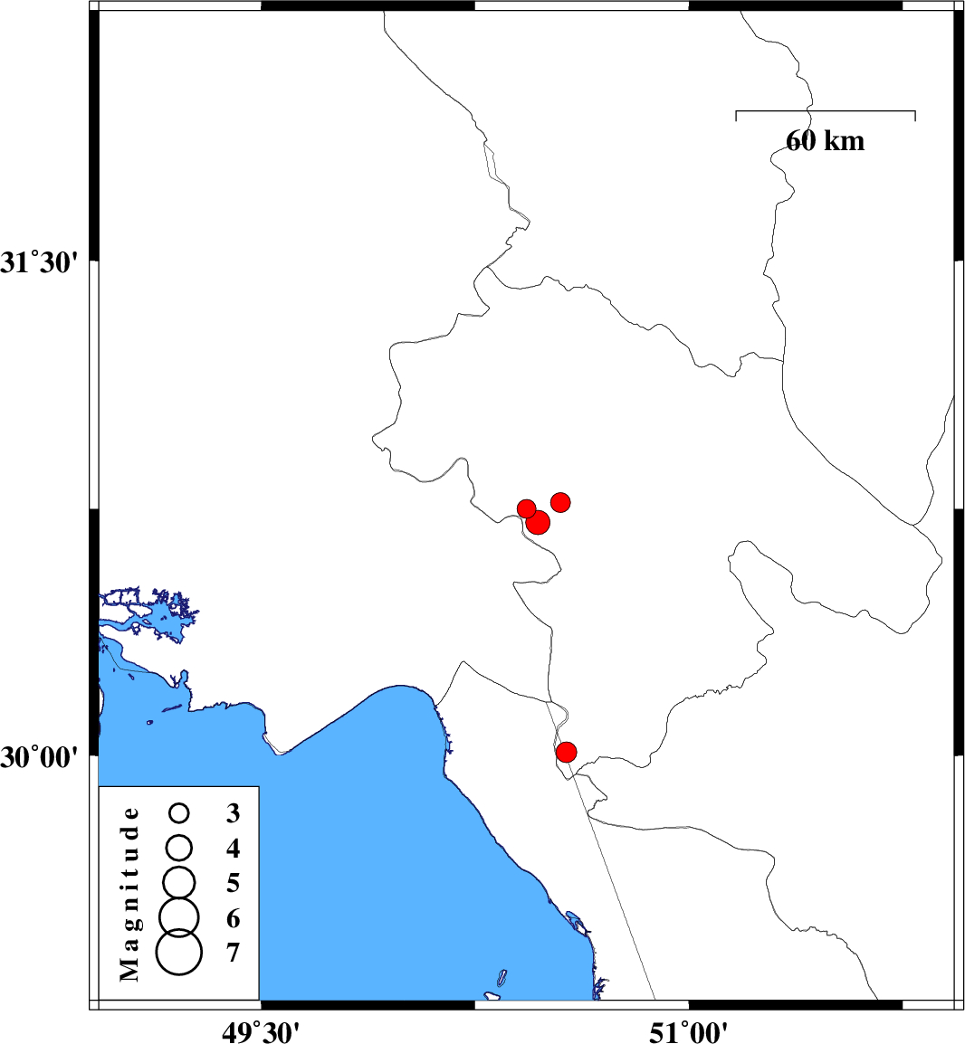 | 2014/06/17 | 13:43:14.7 | 18:13:14.7 | 30.75 | 50.43 | 14 | ML:3 | Kohkiluieh va boyerahmad Province, 14 km West of Dehdasht | ||