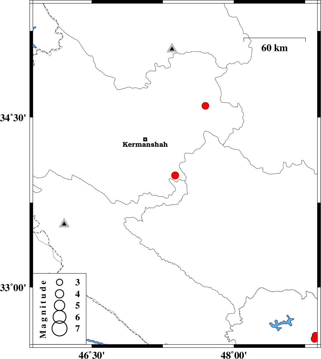 | 2014/06/18 | 06:19:40.9 | 10:49:40.9 | 33.99 | 47.38 | 17 | ML:3.5 | Kermanshah Province, 35 km South-West of Harsin | ||