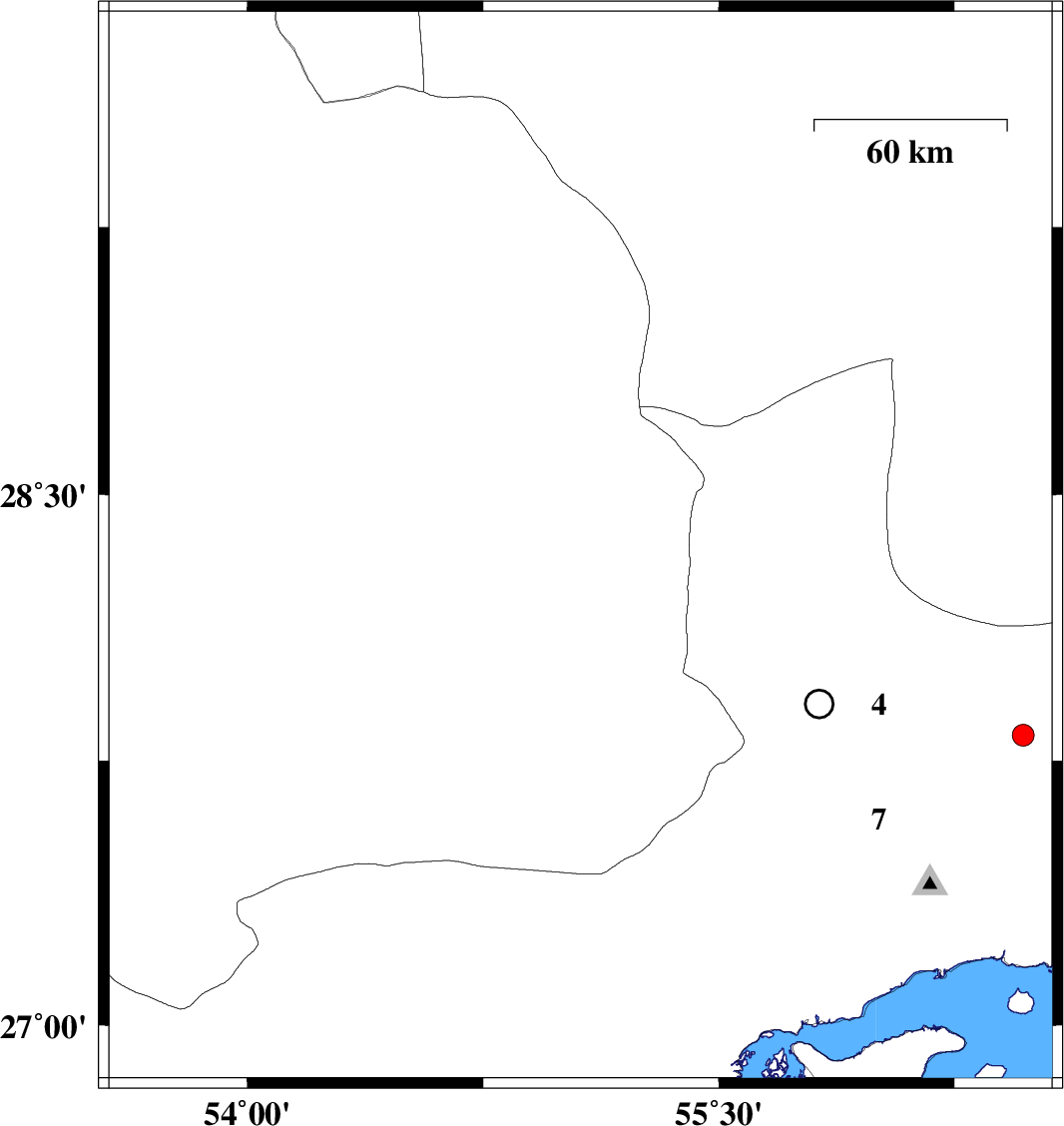 | 2014/07/03 | 04:20:01.1 | 08:50:01.1 | 26.9 | 55.45 | 9 | ML:3.9 | Hormozgan Province, 81 km West of Qeshm |