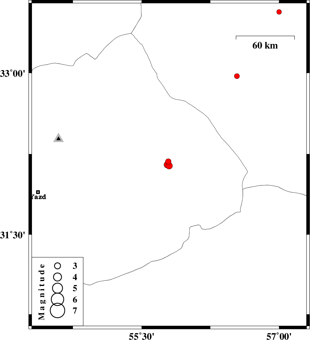 | 2014/07/06 | 03:29:31.7 | 07:59:31.7 | 32.18 | 55.79 | 18 | ML:2.8 | Yazd Province, 74 km North-East of Bafq | ||