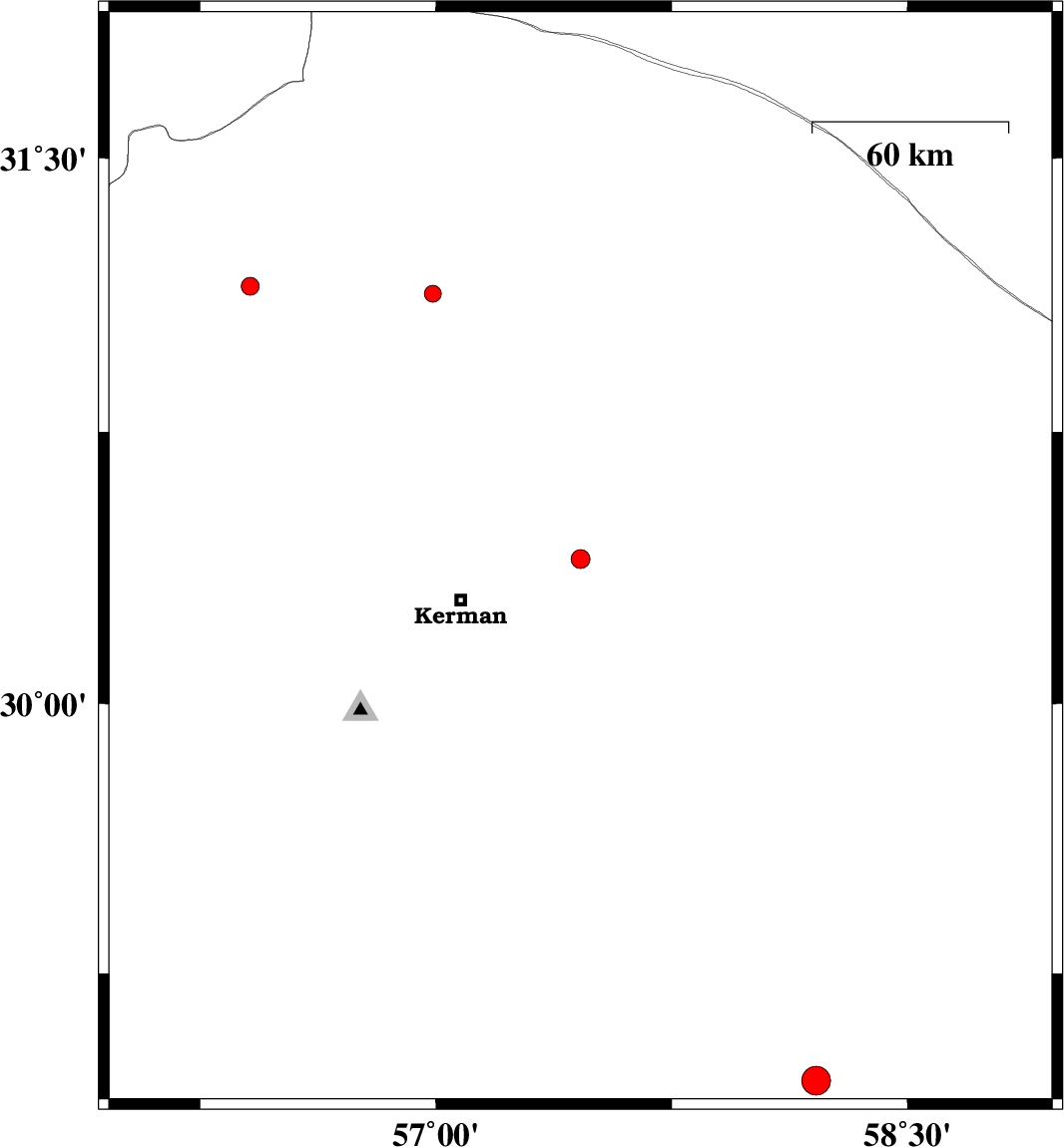 | 2014/07/07 | 18:39:54.9 | 23:09:54.9 | 30.4 | 57.46 | 14 | ML:2.7 | Kerman Province, 38 km North-East of Kerman | ||