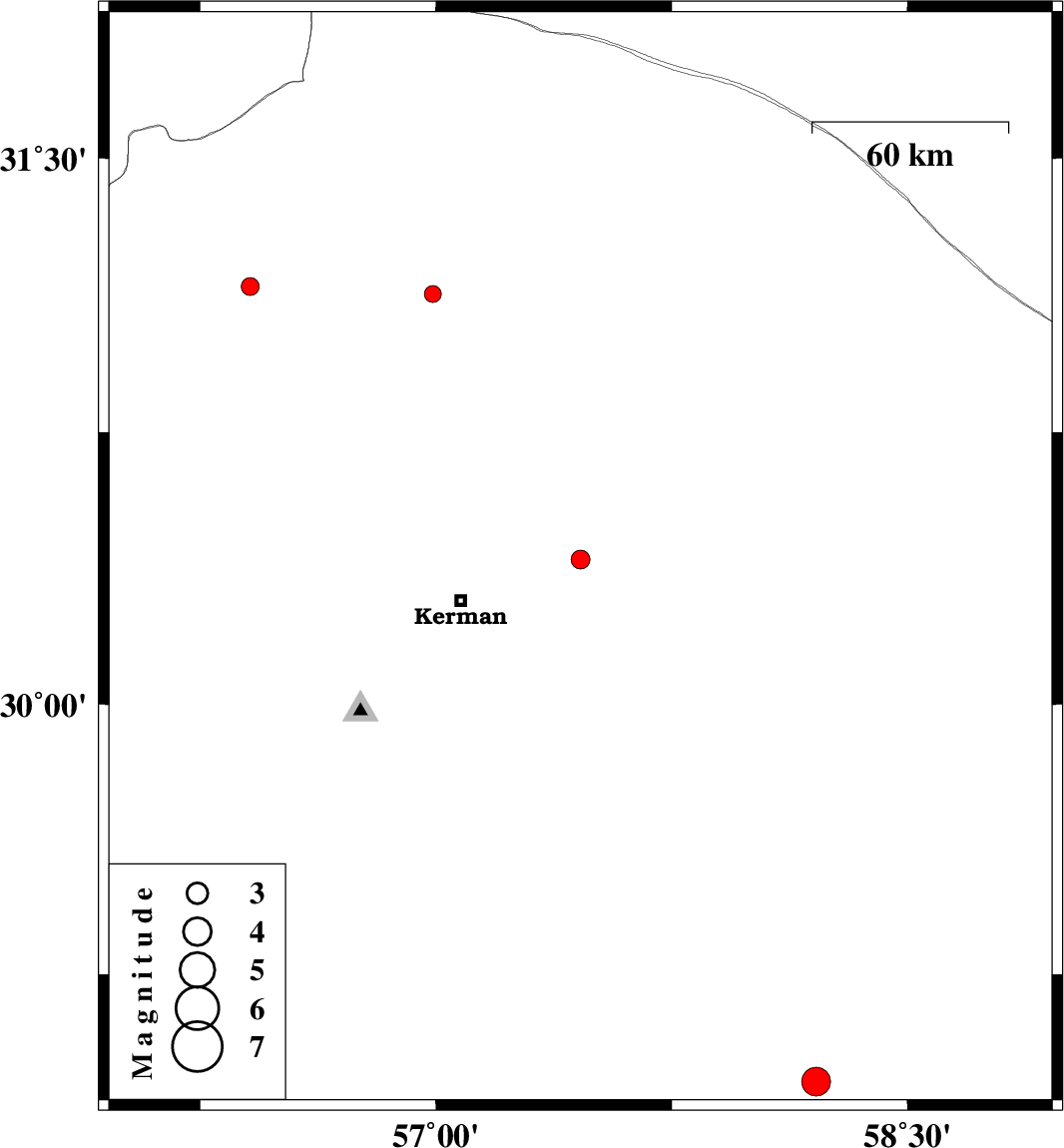 | 2014/06/18 | 00:29:39.8 | 04:59:39.8 | 28.95 | 58.21 | 16 | ML:4.1 | Kerman Province, 22 km South-West of Bam | ||