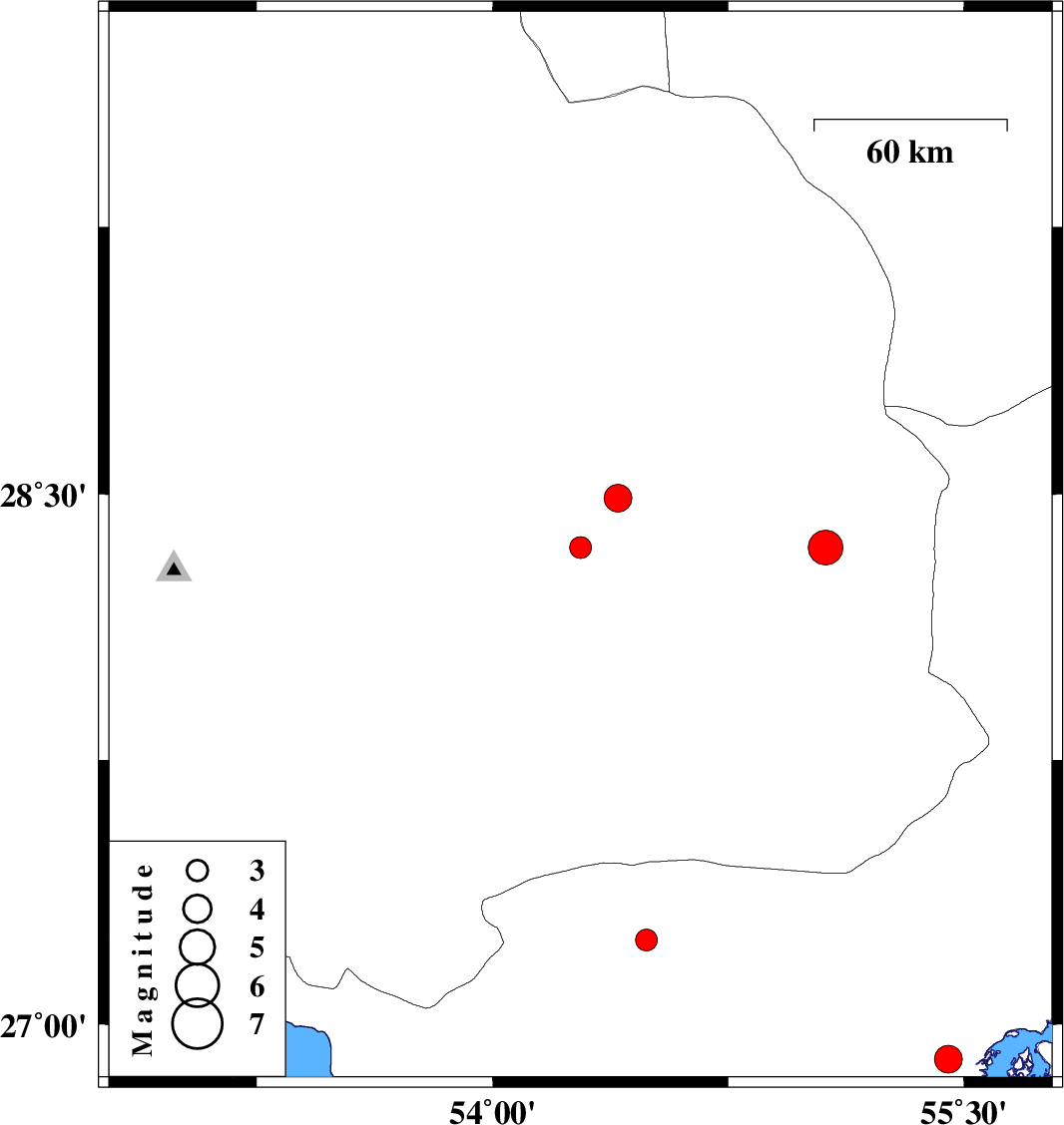 | 2014/07/05 | 03:11:48.3 | 07:41:48.3 | 28.35 | 55.06 | 14 | ML:4.9 | Fars Province, 83 km West of Hajiabad | ||