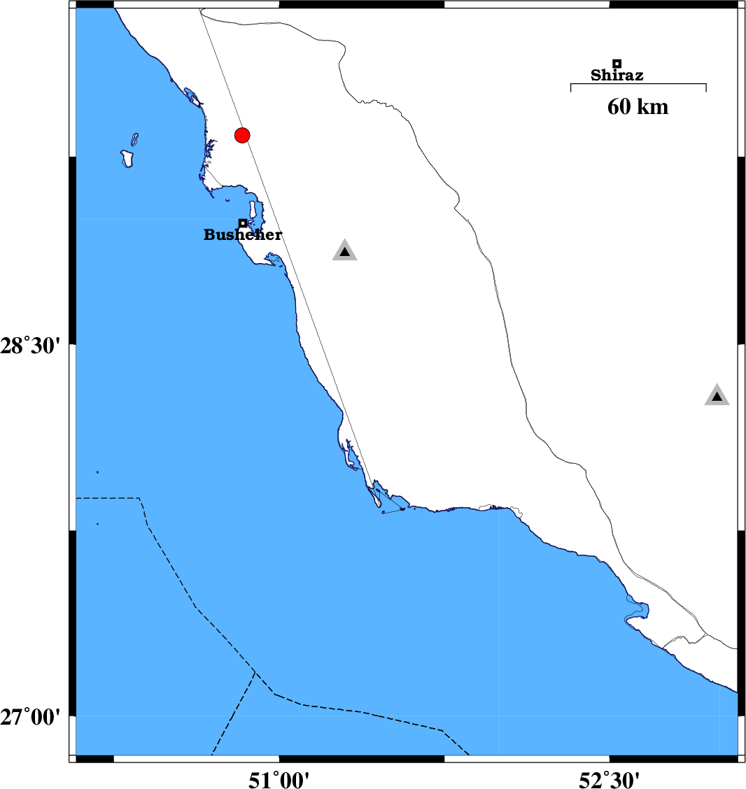 | 2014/08/15 | 14:48:05.1 | 19:18:05.1 | 28.34 | 51.58 | 14 | ML:4.5 | Bushehr Province, 40 km South-East of Khormog | ||