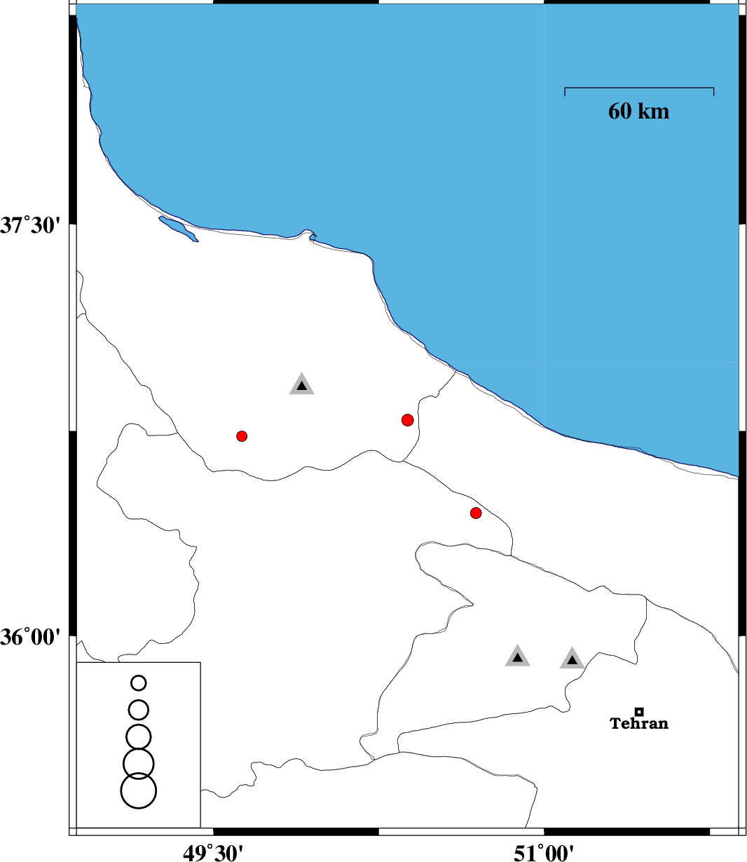 | 2014/08/16 | 11:43:14.4 | 16:13:14.4 | 36.79 | 50.38 | 15 | ML:2.4 | Gilan Province, 27 km South-West of Ramsar | ||