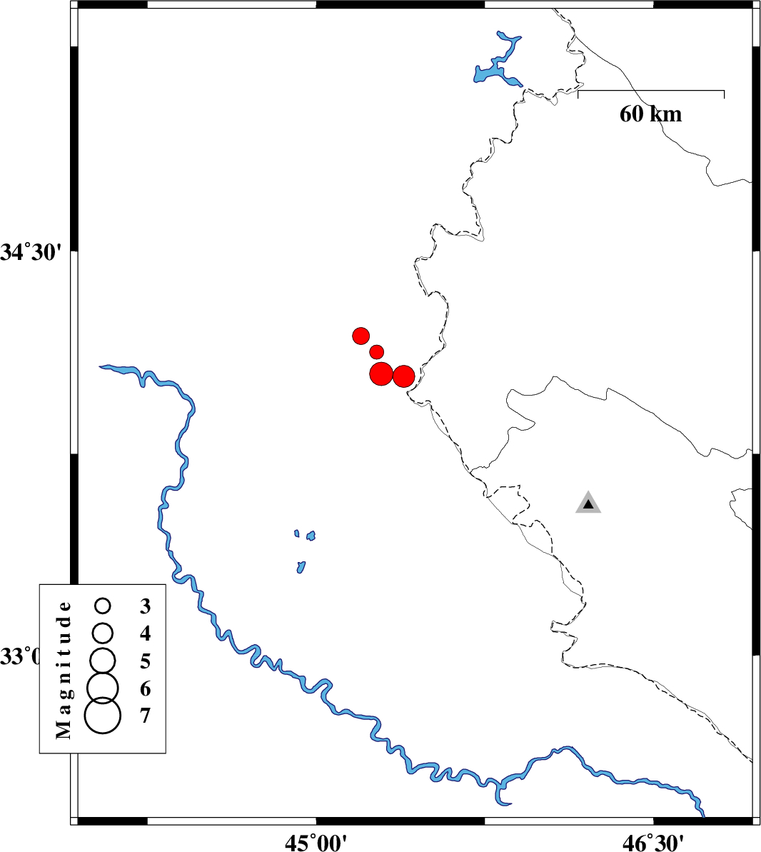 | 2014/08/31 | 04:54:54.8 | 09:24:54.8 | 33.95 | 45.37 | 14 | ML:3.4 | Iraq, 55 km South-West of Gilan-E-Gharb |