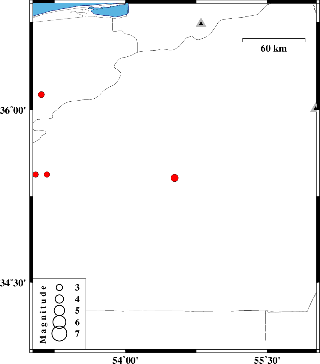 | 2014/09/19 | 19:08:13.8 | 23:38:13.8 | 35.44 | 53.05 | 14 | ML:2.7 | Semnan Province, 35 km South-West of Semnan | ||