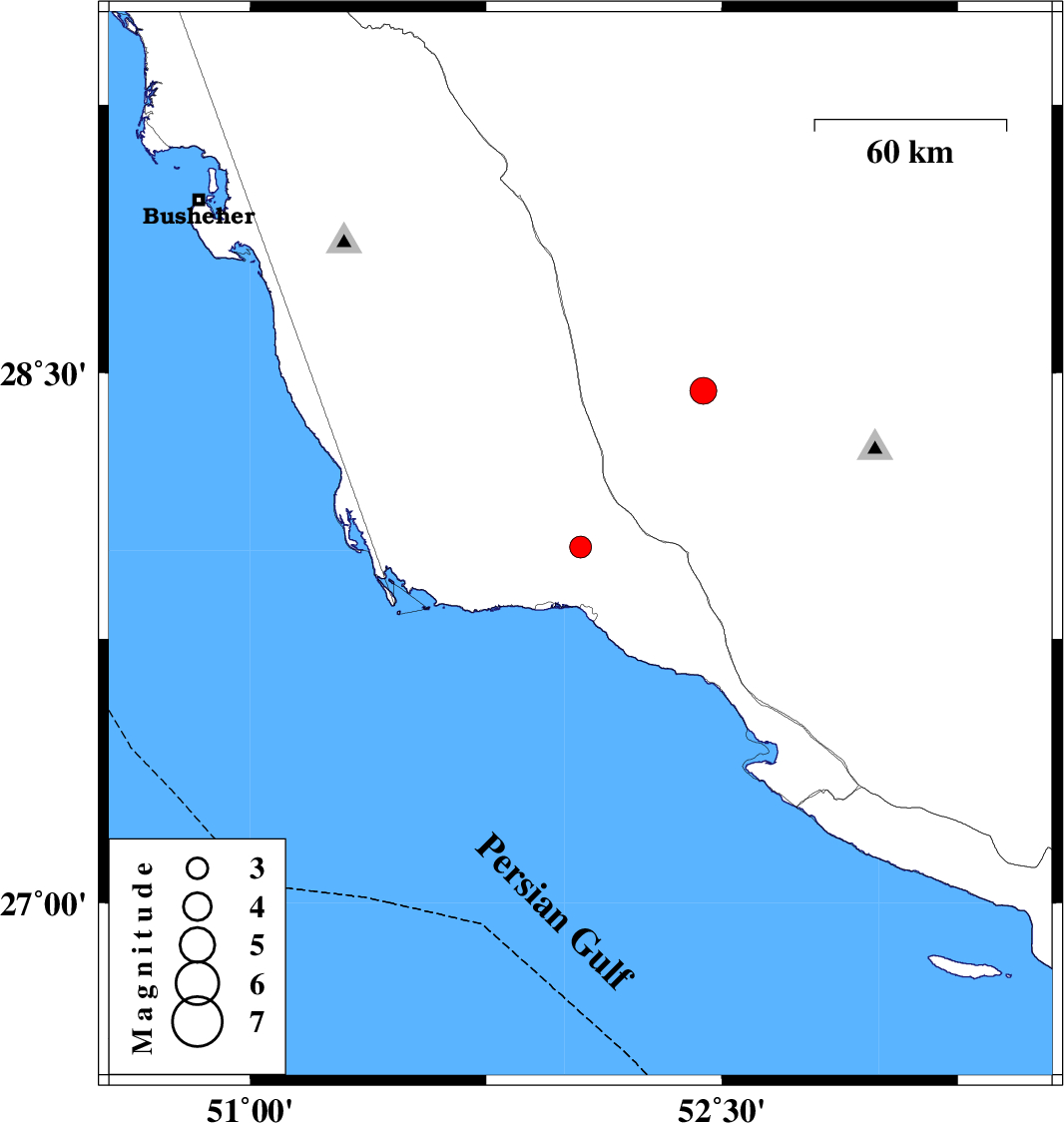 | 2014/09/27 | 01:37:36.6 | 05:07:36.6 | 28.01 | 52.05 | 43 | ML:3.1 | Bushehr Province, 20 km North of Bandar-e kangan | ||