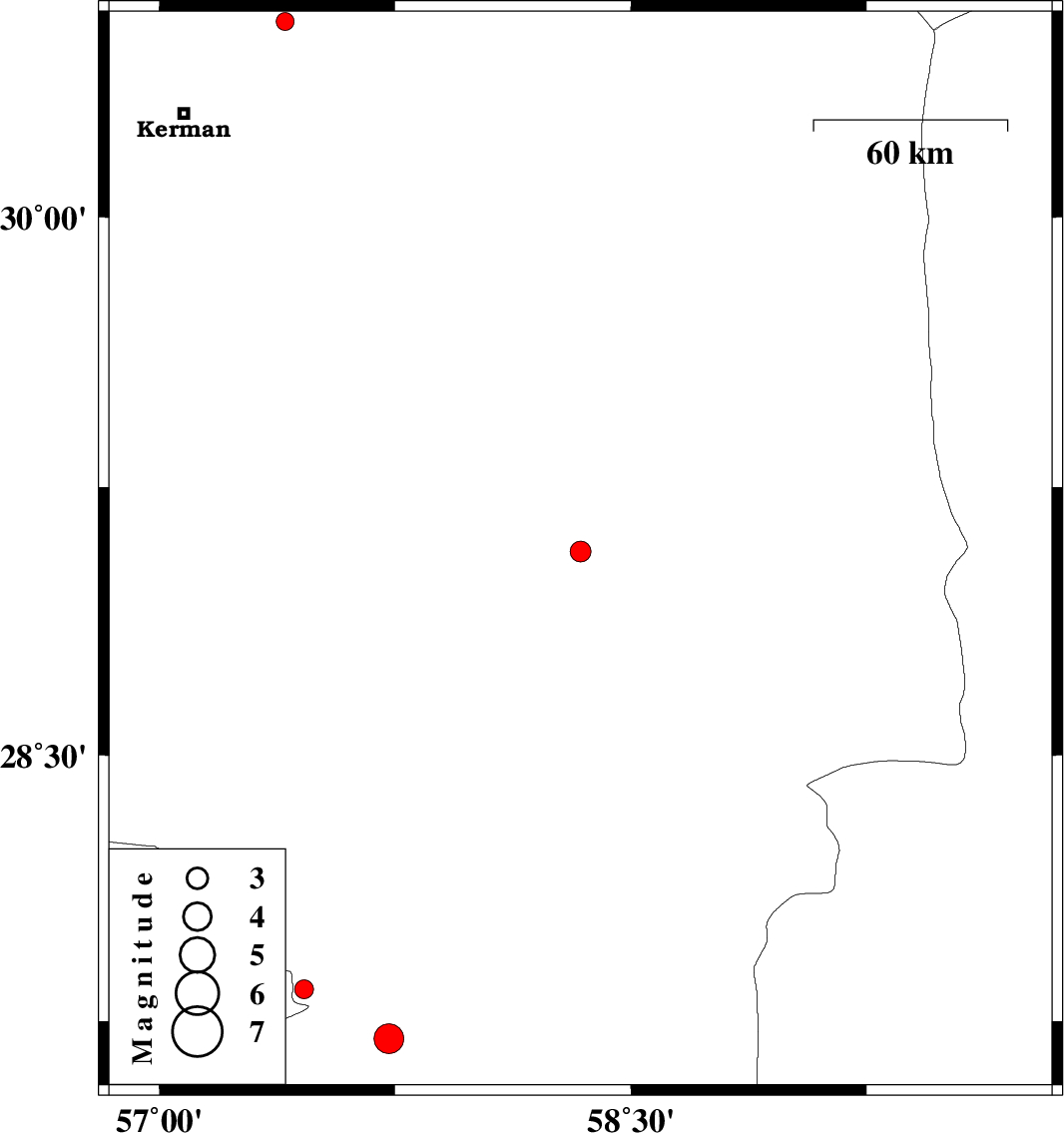 | 2014/09/28 | 03:33:43.5 | 07:03:43.5 | 27.84 | 57.46 | 14 | ML:2.7 | Kerman Province, 27 km South-West of Kahnuj | ||