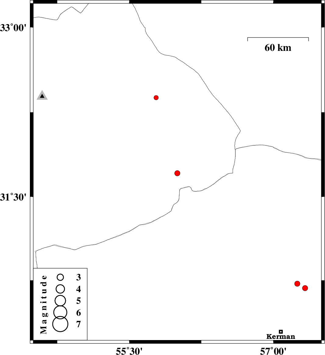 | 2014/09/25 | 21:21:56.2 | 00:51:56.2 | 30.72 | 57.25 | 14 | ML:2.6 | Kerman Province, 50 km North-East of Kerman |
