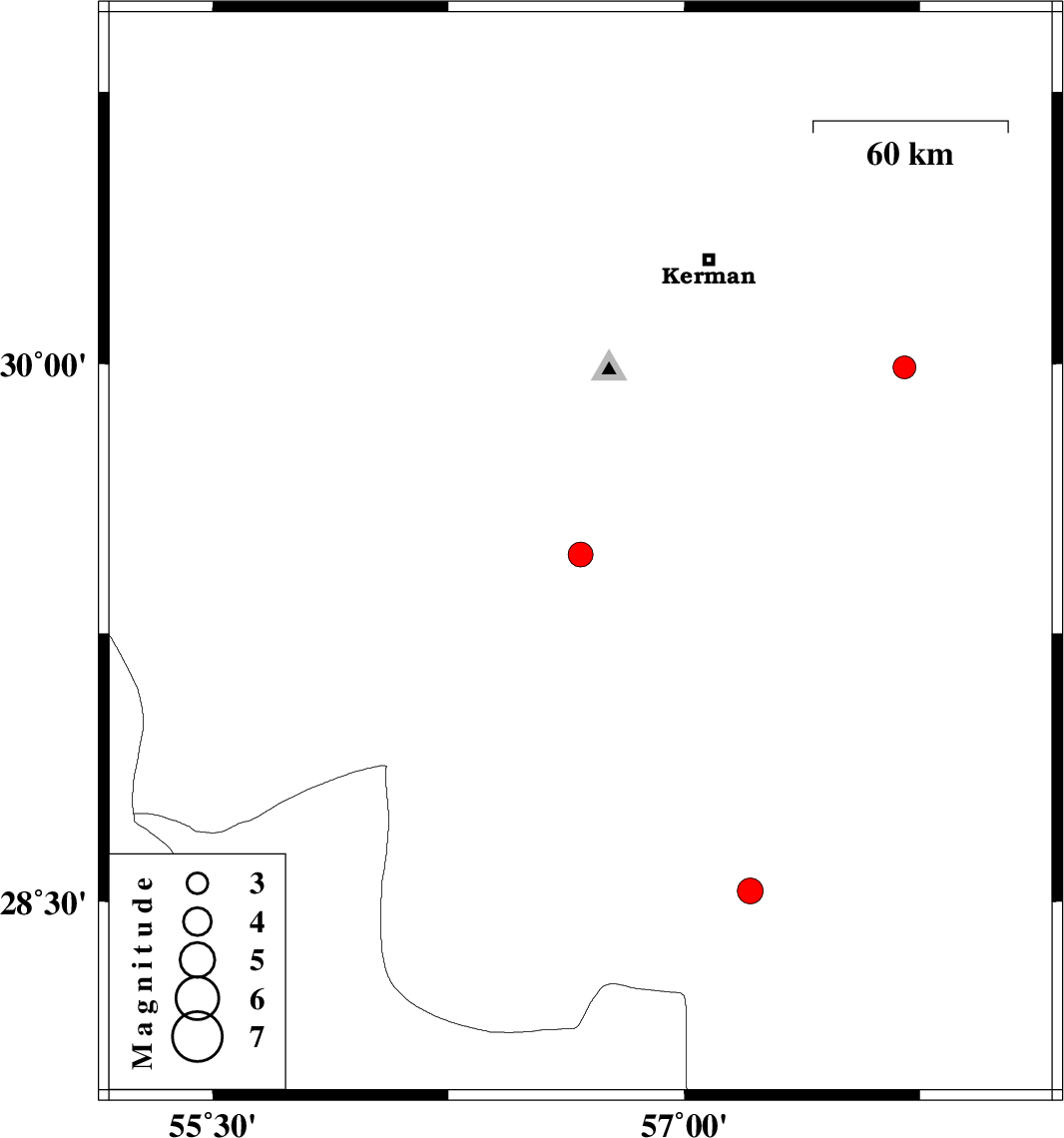| 2014/09/30 | 22:44:00.3 | 02:14:00.3 | 29.99 | 57.7 | 17 | ML:3.3 | Kerman Province, 69 km South-East of Kerman |
