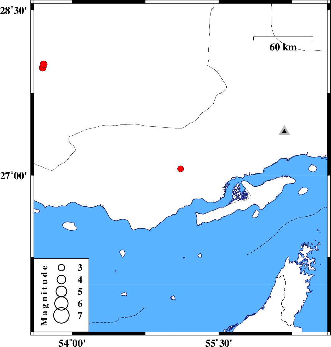 | 2014/10/04 | 21:13:20.0 | 00:43:20.0 | 27.98 | 53.7 | 16 | ML:3.3 | Fars Province, 60 km South-East of Jahrom |