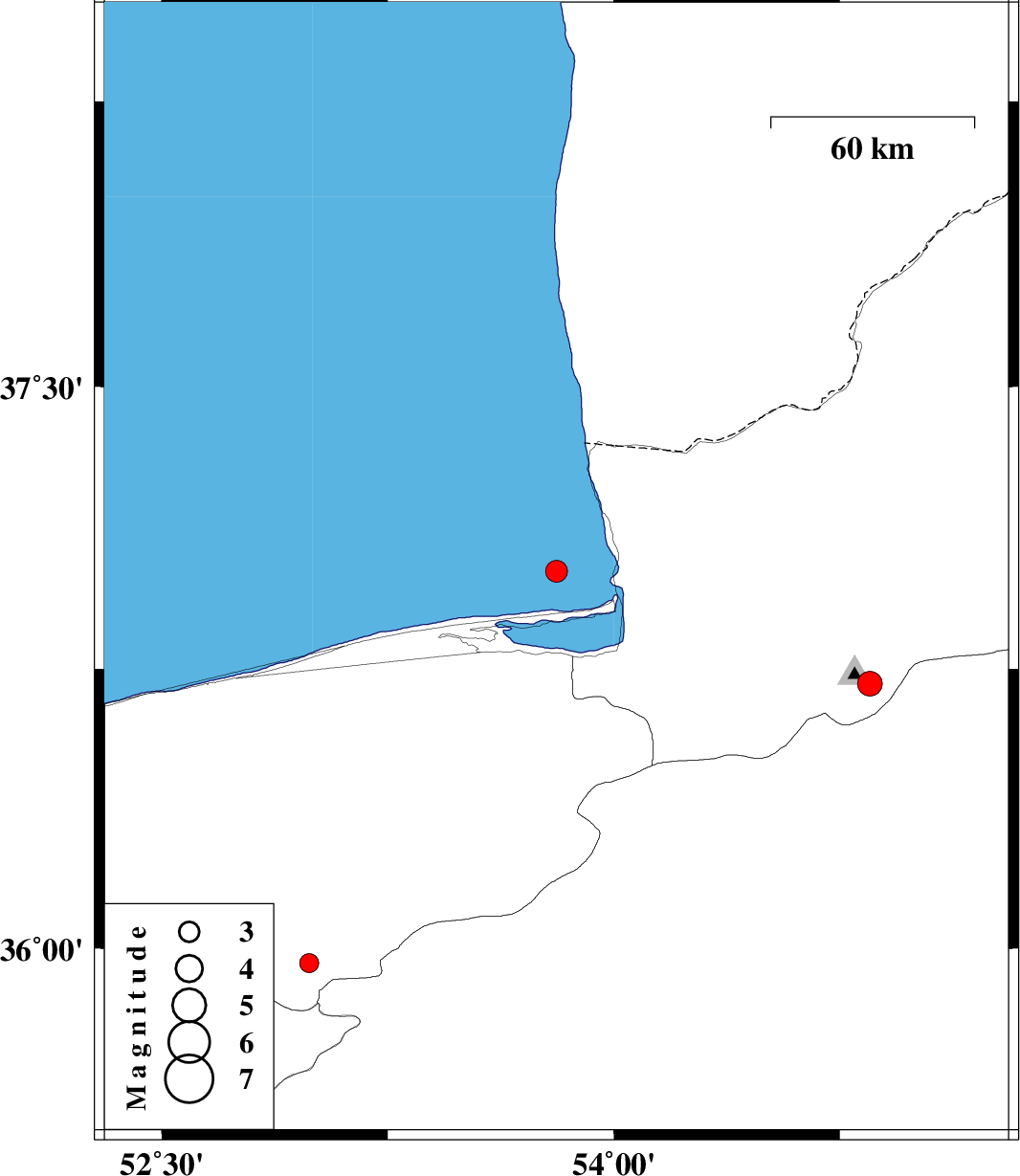 | 2014/10/22 | 07:22:01.1 | 10:52:01.1 | 37.01 | 53.81 | 14 | ML:3.2 | Caspian Sea, 26 km North-West of Bandar-e torkaman | ||