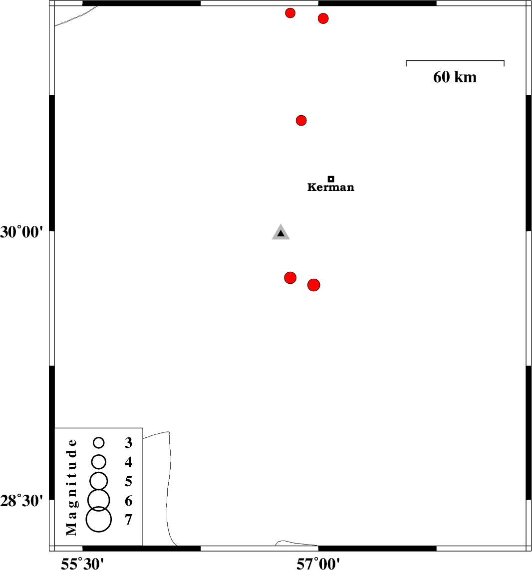 | 2014/10/20 | 00:44:01.7 | 04:14:01.7 | 31.17 | 57.03 | 14 | ML:3 | Kerman Province, 23 km East of Ravar | ||