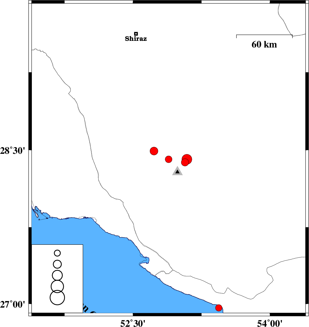 | 2014/10/28 | 09:04:10.3 | 12:34:10.3 | 28.41 | 52.89 | 16 | ML:3.4 | Fars Province, 16 km West of Qir va Karzin | ||