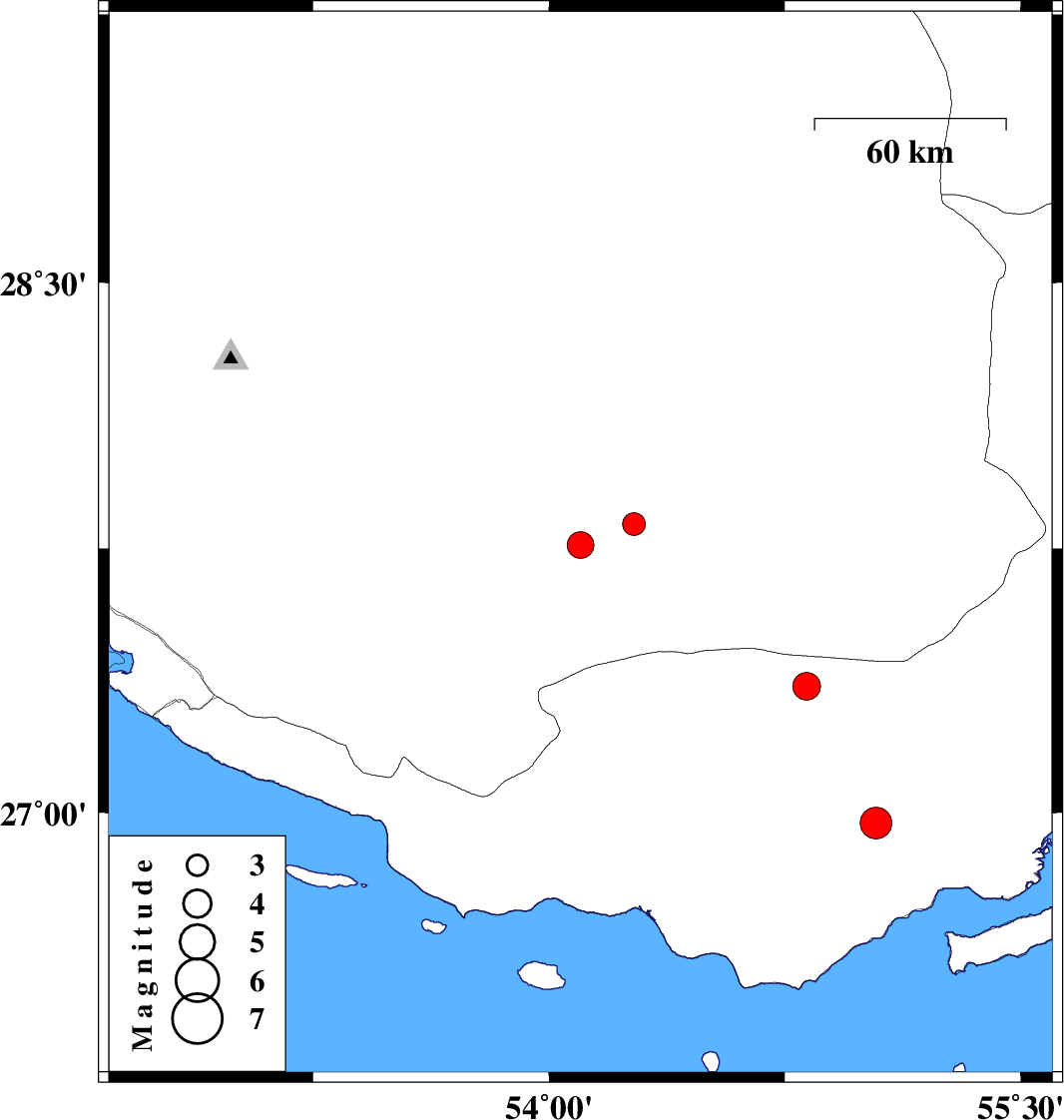 | 2014/11/06 | 01:14:26.6 | 04:44:26.6 | 27.76 | 54.1 | 14 | ML:3.8 | Fars Province, 25 km West of Lar | ||