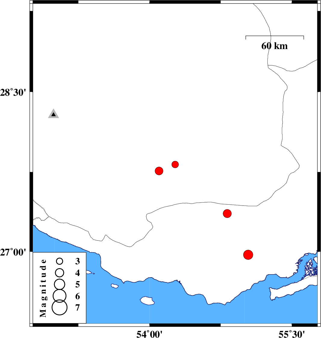 | 2014/11/06 | 01:14:26.6 | 04:44:26.6 | 27.76 | 54.1 | 14 | ML:3.8 | Fars Province, 25 km West of Lar | ||