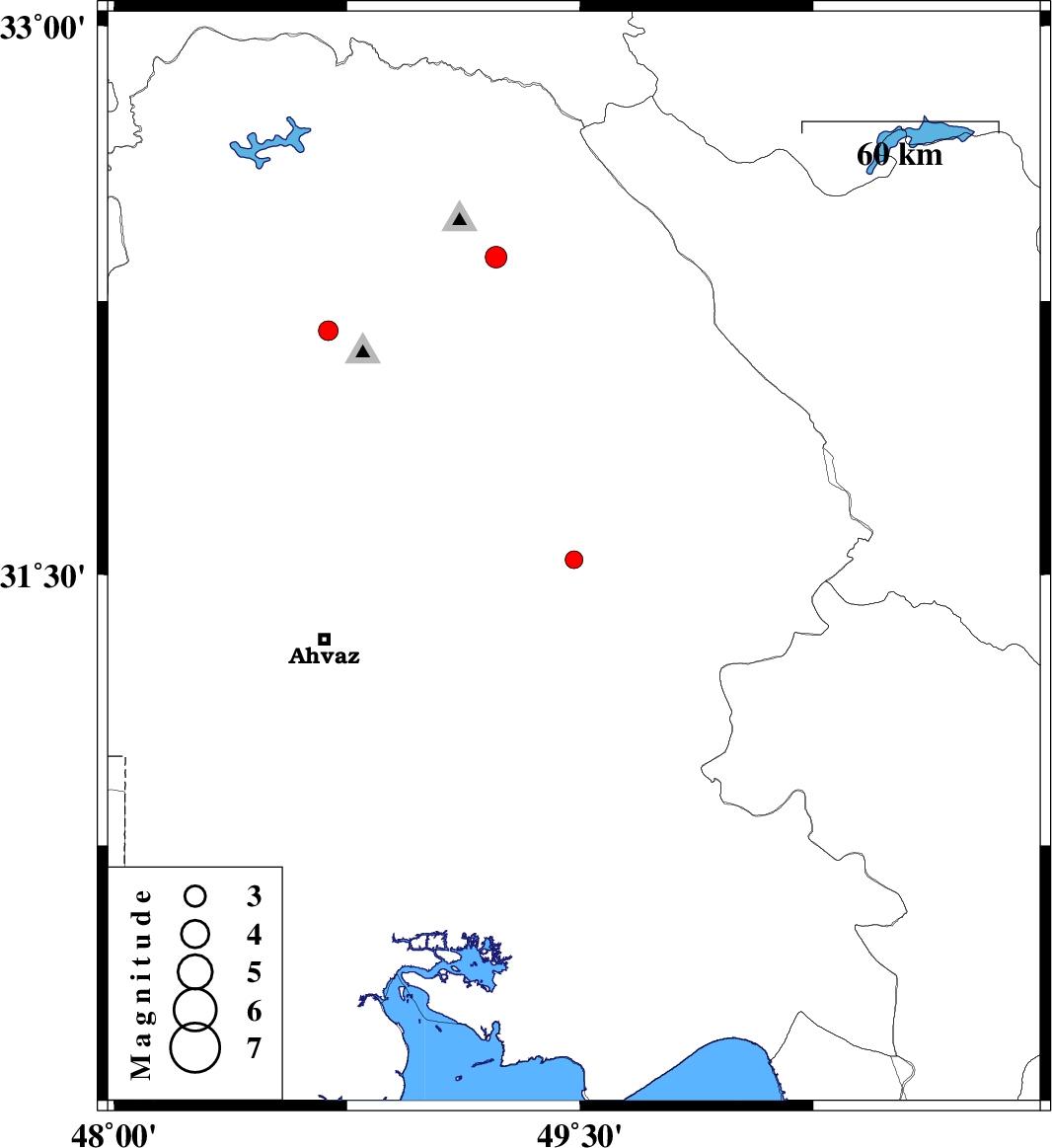 | 2014/10/31 | 01:49:37.7 | 05:19:37.7 | 32.17 | 48.69 | 18 | ML:2.8 | Khoozestan Province, 21 km North-West of Shushtar |