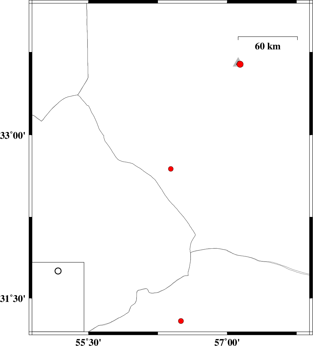 | 2014/12/13 | 05:17:56.5 | 08:47:56.5 | 33.64 | 57.14 | 12 | ML:3.1 | Yazd Province, 20 km East of Tabas | ||