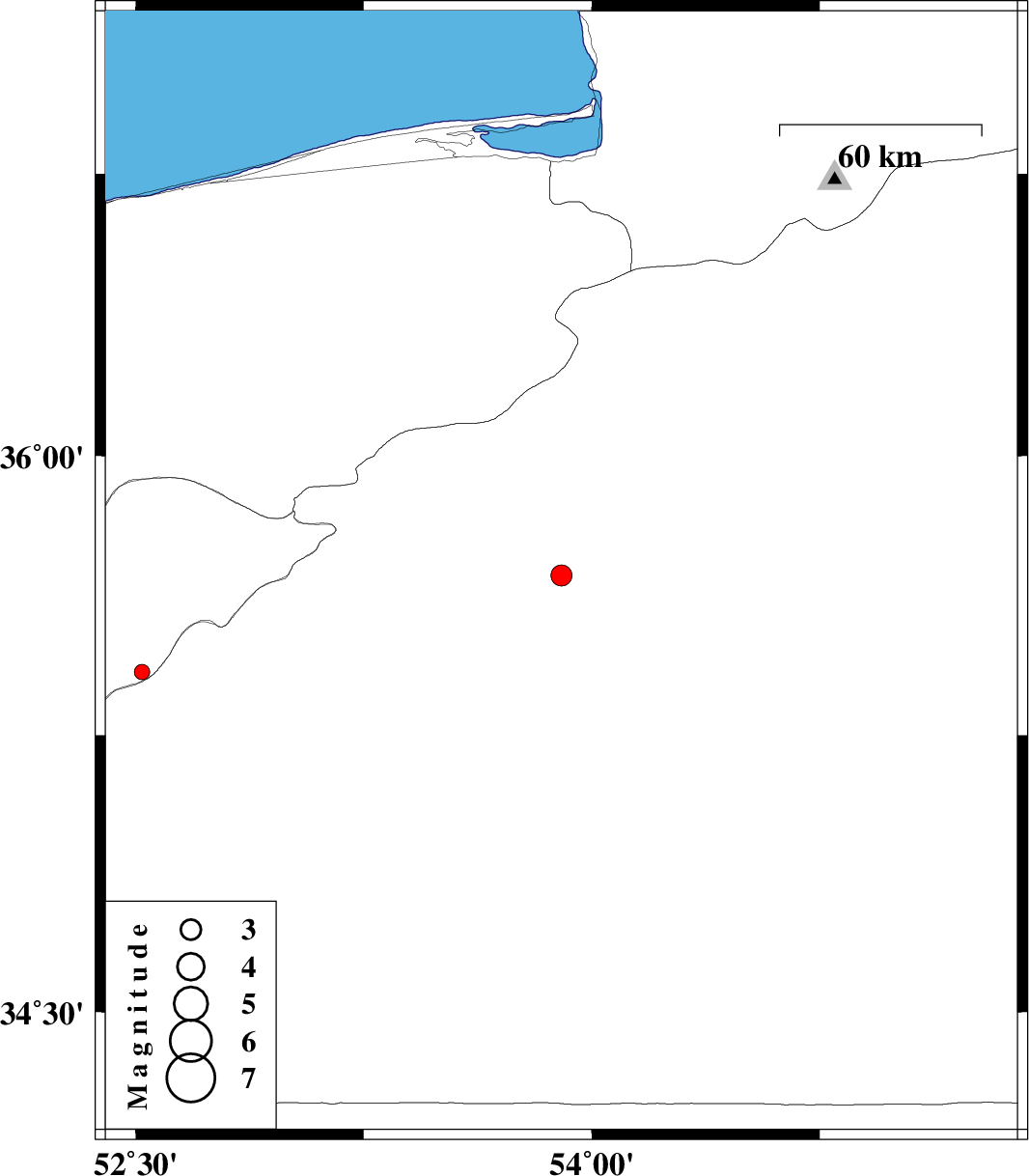 | 2014/12/24 | 02:16:36.9 | 05:46:36.9 | 35.68 | 53.9 | 14 | ML:3.1 | Semnan Province, 47 km North-East of Semnan | ||