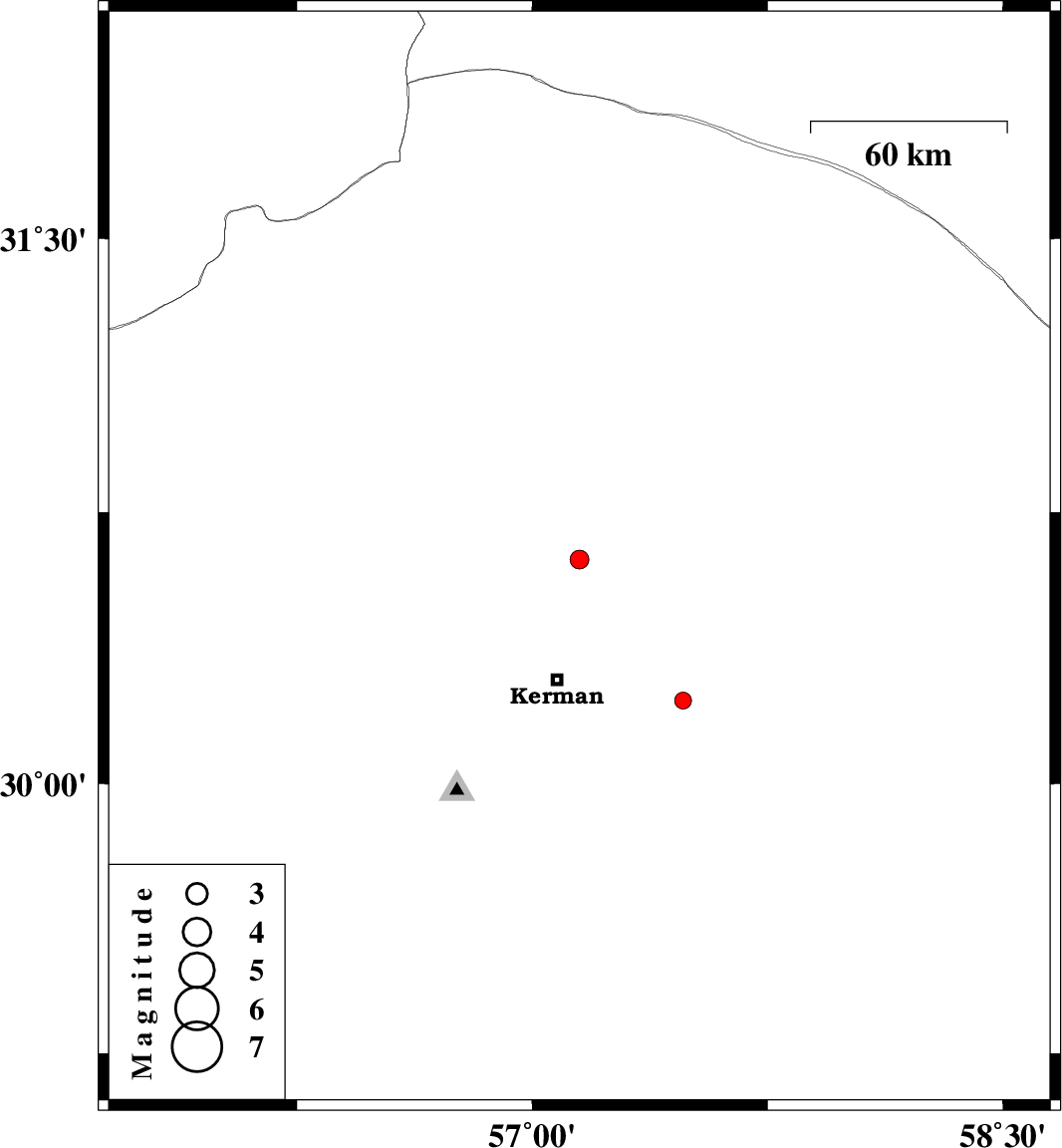 | 2014/12/28 | 10:15:25.6 | 13:45:25.6 | 30.62 | 57.15 | 18 | ML:2.7 | Kerman Province, 38 km North of Kerman |