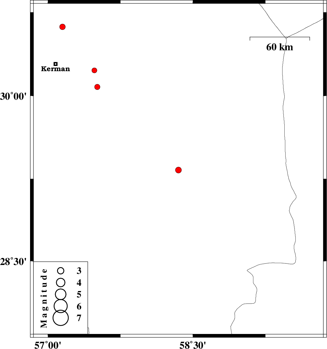| 2014/12/30 | 10:23:10.5 | 13:53:10.5 | 30.08 | 57.51 | 14 | ML:2.5 | Kerman Province, 48 km South-East of Kerman | ||