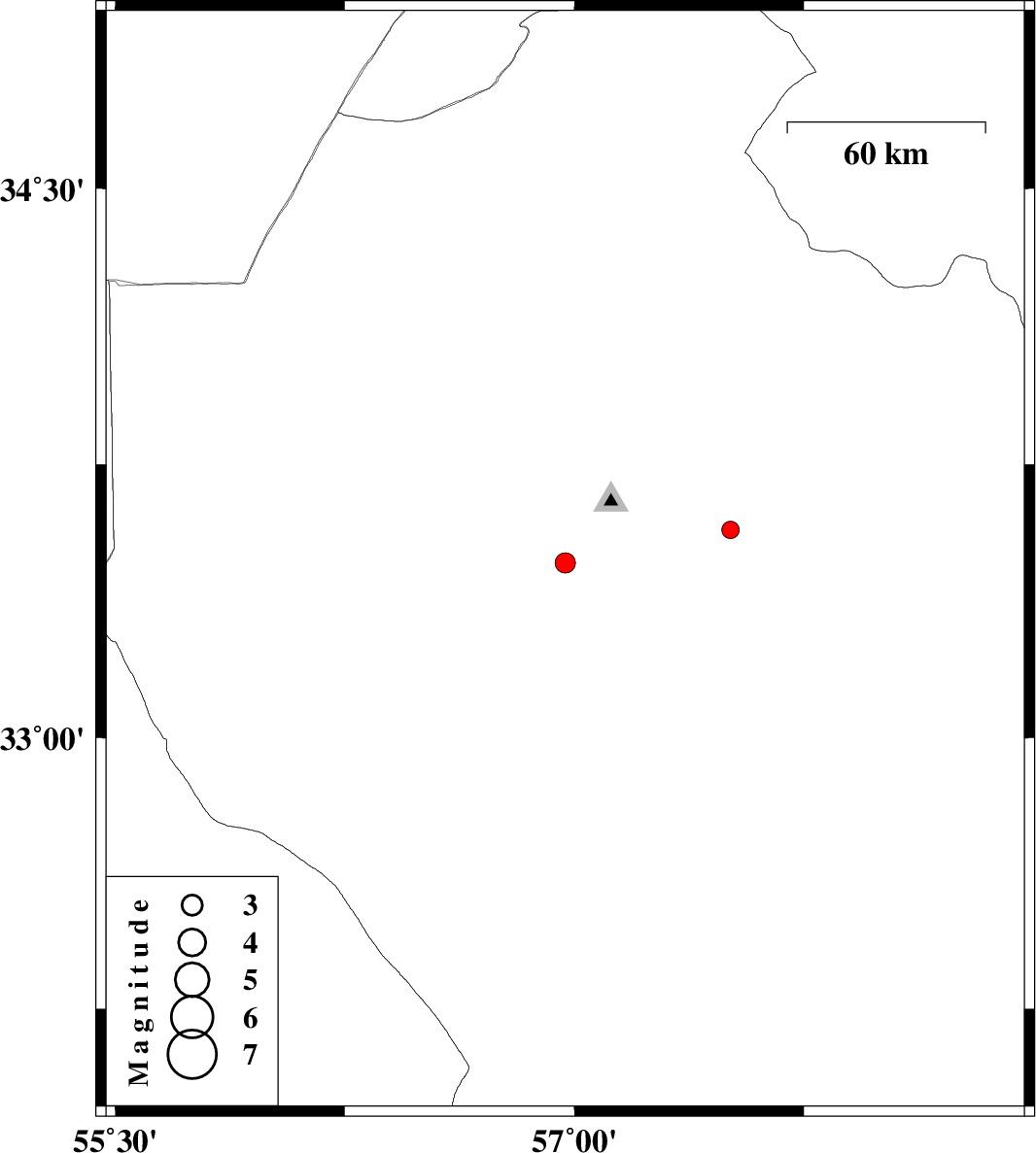 | 2015/01/19 | 04:11:50.0 | 07:41:50.0 | 33.57 | 57.51 | 14 | ML:2.5 | Khorasan(center) Province, 54 km East of Tabas |