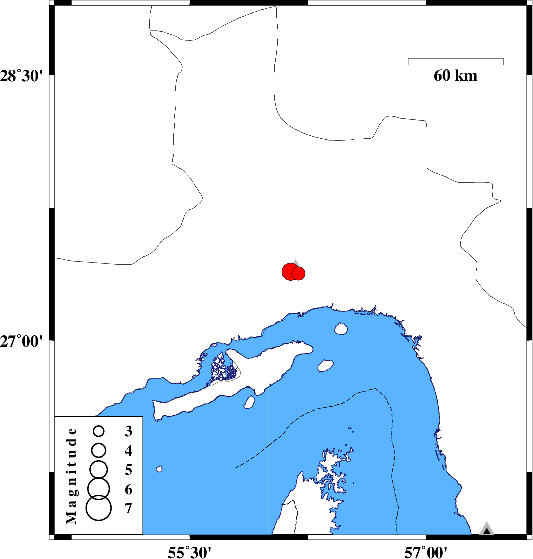 | 2015/01/25 | 20:11:19.3 | 23:41:19.3 | 27.39 | 56.14 | 14 | ML:5 | Hormozgan Province, 27 km North-West of Bandar-e abbas |
