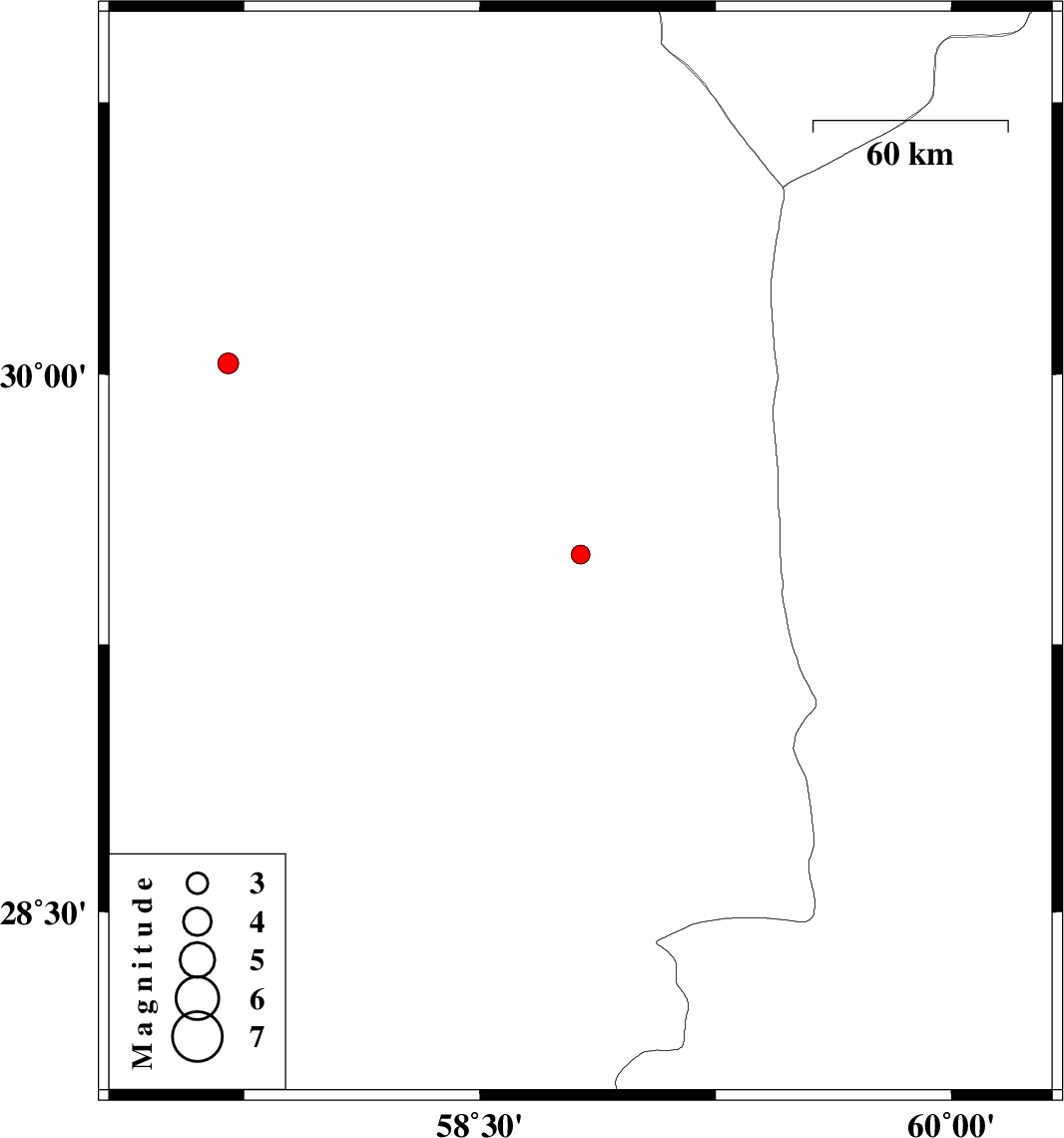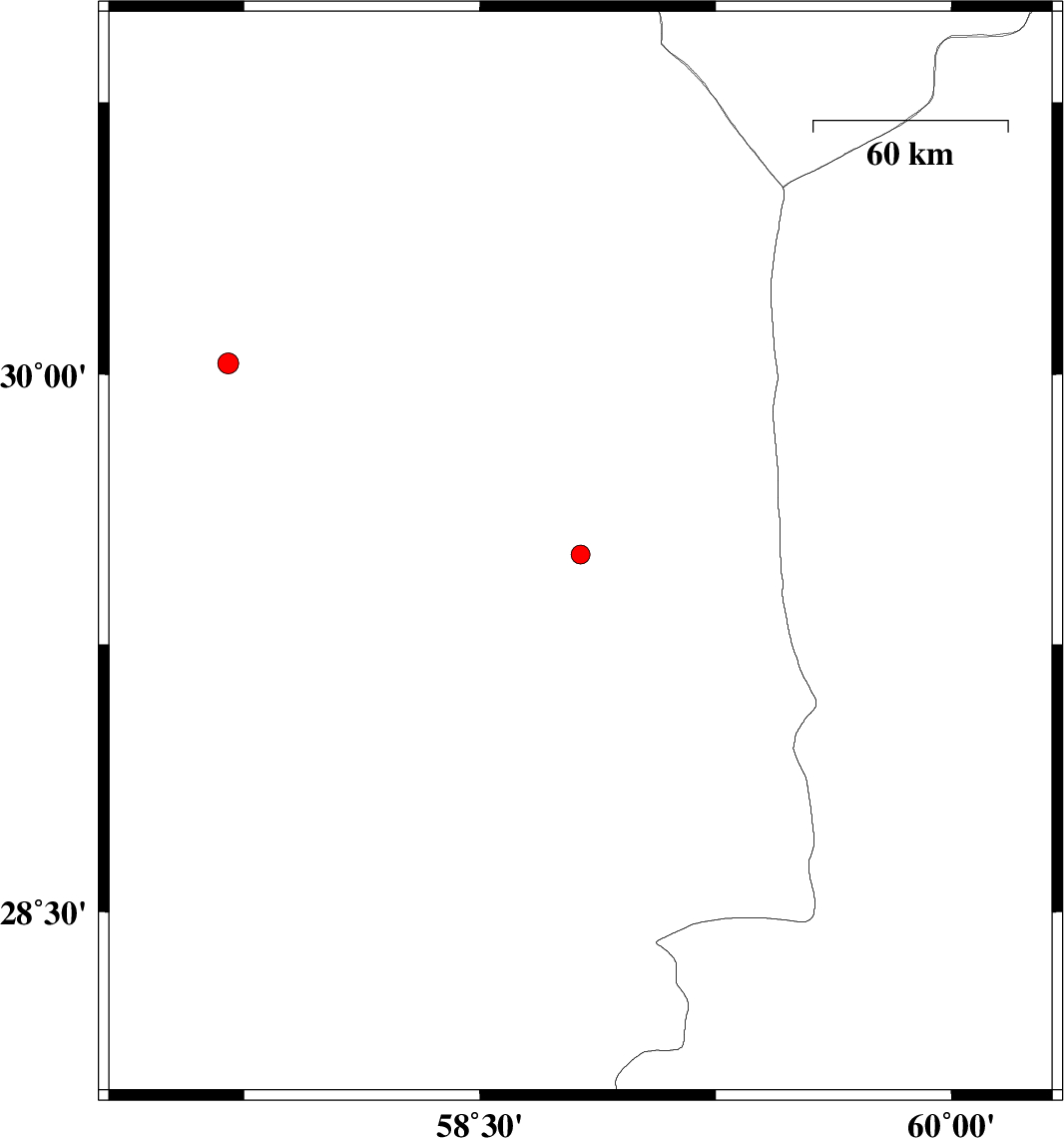 | 2015/02/05 | 15:02:30.9 | 18:32:30.9 | 29.5 | 58.82 | 14 | ML:2.7 | Kerman Province, 63 km North-East of Bam | ||