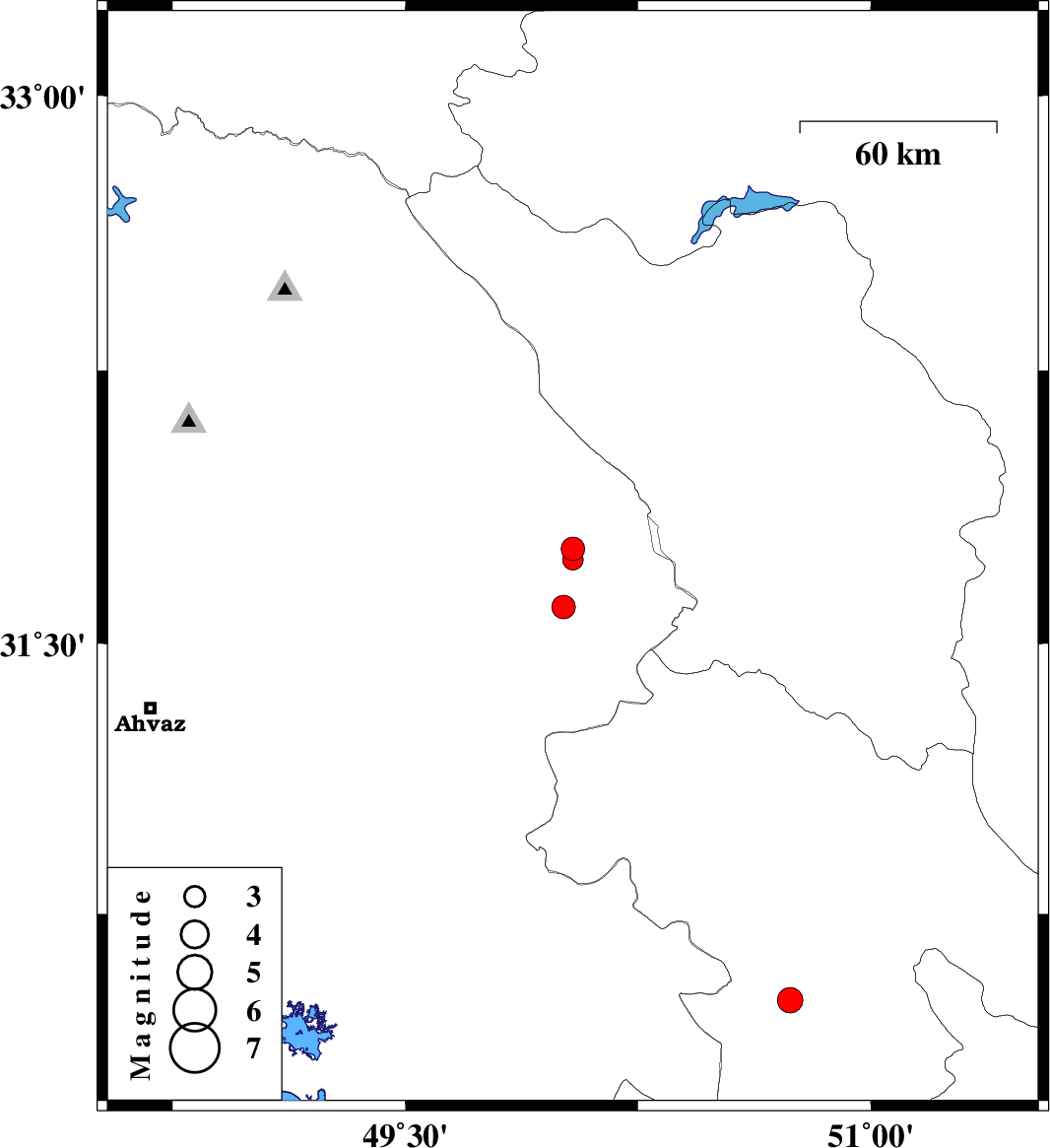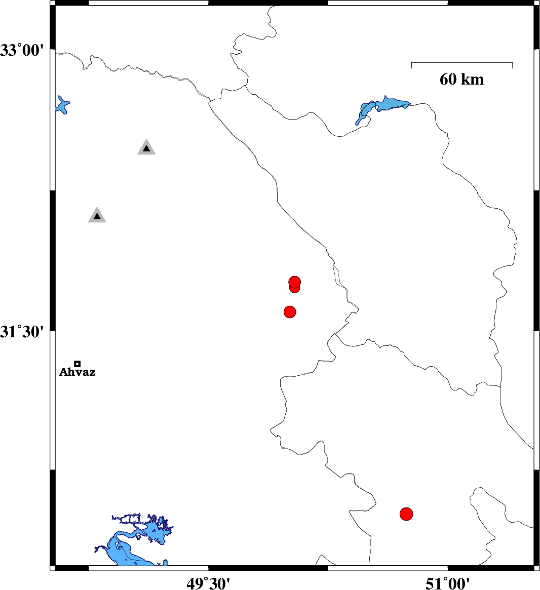 | 2015/02/08 | 19:50:05.7 | 23:20:05.7 | 31.6 | 50.01 | 14 | ML:3.4 | Khoozestan Province, 14 km East of Bagh Malek | ||