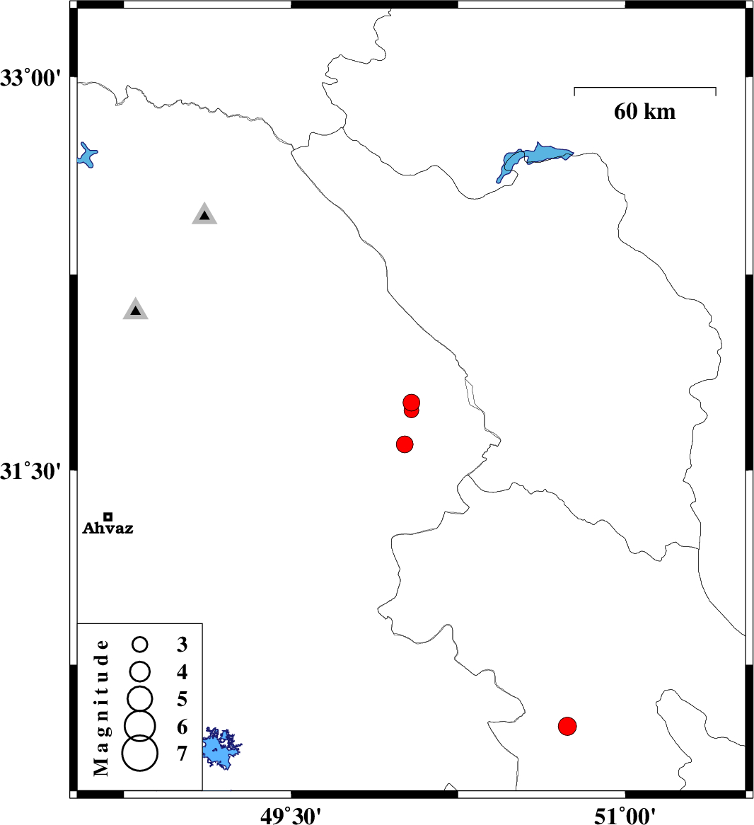 | 2015/02/08 | 19:50:05.7 | 23:20:05.7 | 31.6 | 50.01 | 14 | ML:3.4 | Khoozestan Province, 14 km East of Bagh Malek | ||
