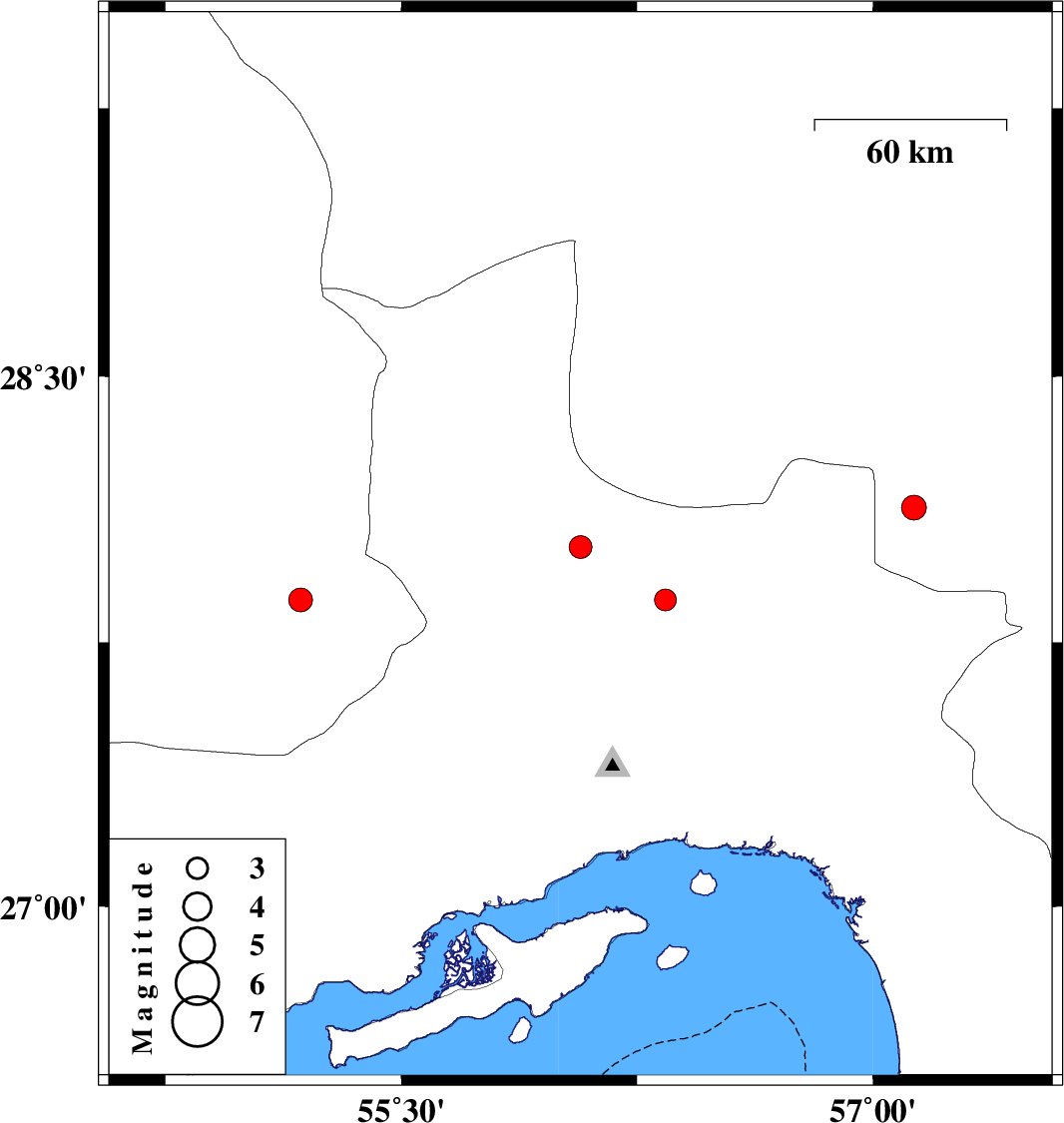 | 2015/02/10 | 18:49:50.4 | 22:19:50.4 | 28.13 | 57.13 | 6 | ML:3.5 | Kerman Province, 59 km North-West of Kahnuj | ||