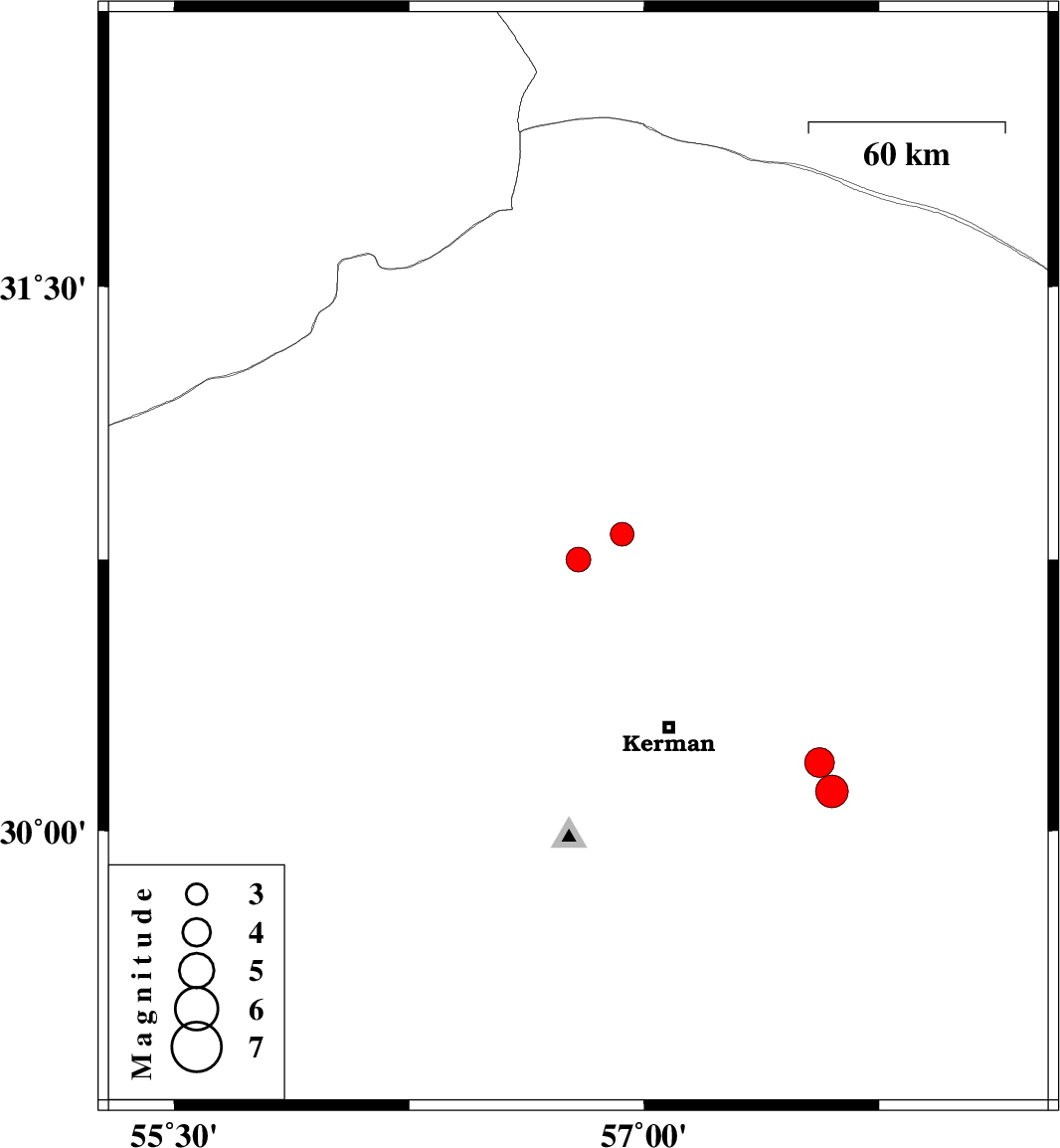 | 2015/02/17 | 13:41:37.4 | 17:11:37.4 | 30.11 | 57.6 | 14 | ML:4.6 | Kerman Province, 53 km South-East of Kerman | ||