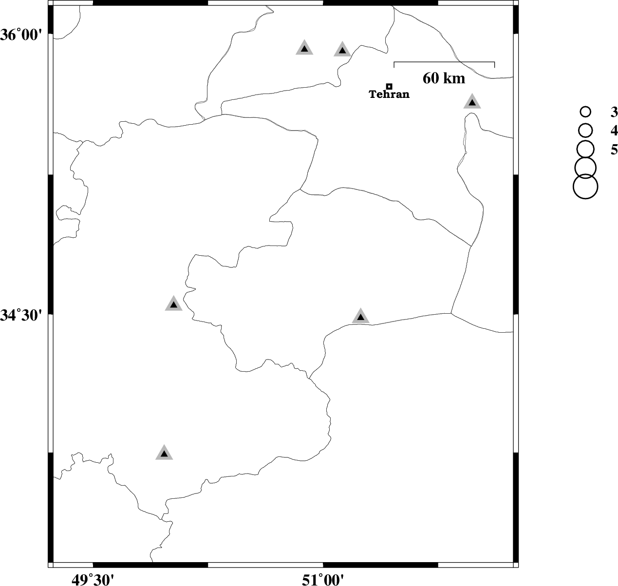 | 2015/02/18 | 20:06:24.5 | 23:36:24.5 | 35.23 | 51.24 | 14 | ML:2.2 | Tehran Province, 39 km South of Eslamshahr |