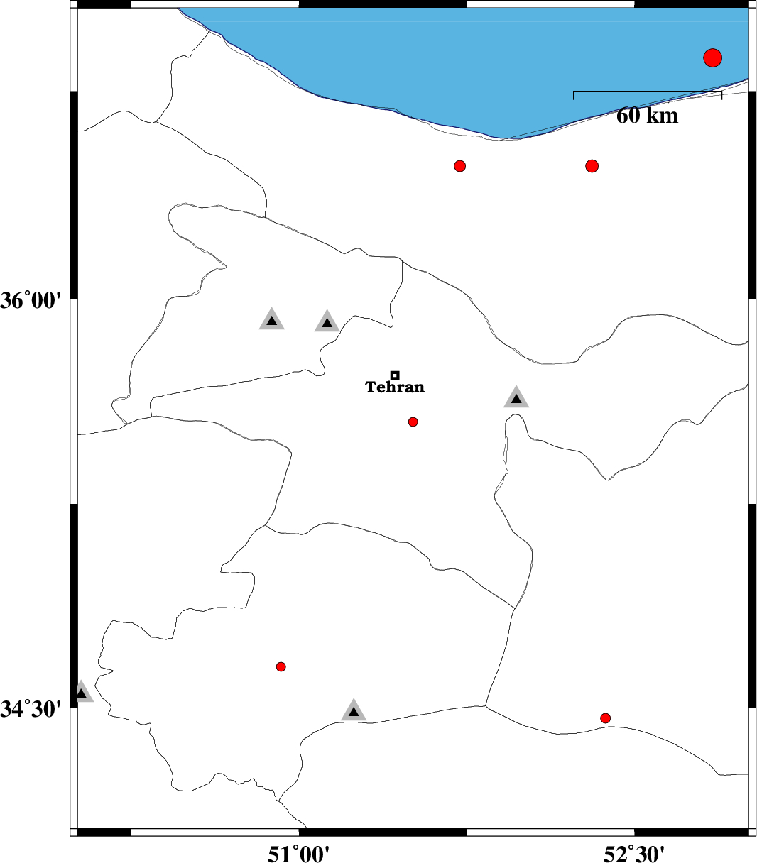 | 2015/03/02 | 22:38:37.3 | 02:08:37.3 | 36.87 | 52.85 | 14 | ML:3.6 | Caspian Sea, 26 km North of Joybar | ||