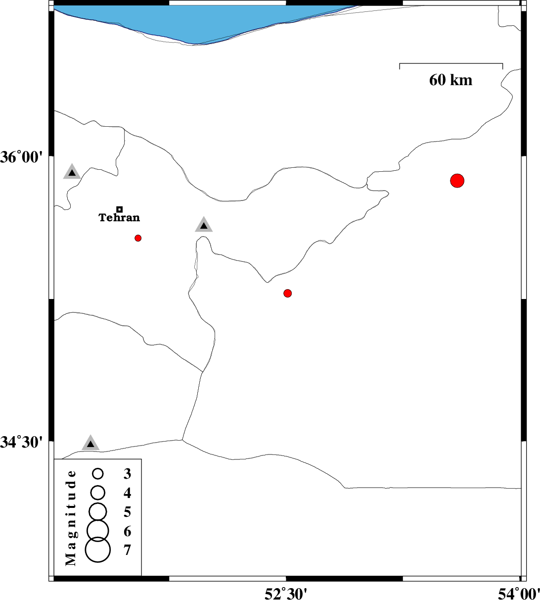 | 2015/03/15 | 00:29:34.9 | 03:59:34.9 | 35.87 | 53.6 | 15 | ML:3.9 | Semnan Province, 38 km North-East of Semnan | ||