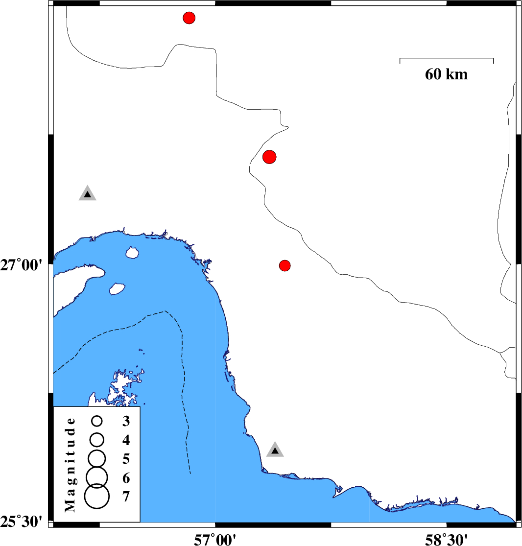 | 2015/03/13 | 06:00:36.6 | 09:30:36.6 | 27.62 | 57.35 | 14 | ML:4 | Kerman Province, 24 km North-East of Dehbarez |