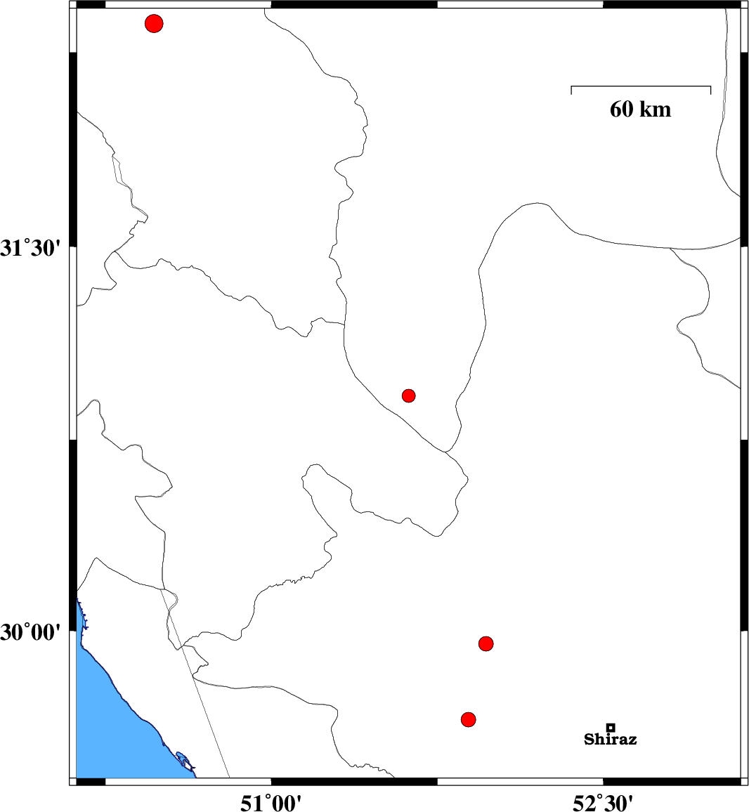 | 2015/03/30 | 20:21:29.4 | 00:51:29.4 | 29.95 | 51.97 | 15 | ML:2.9 | Fars Province, 34 km South of Ardakan |