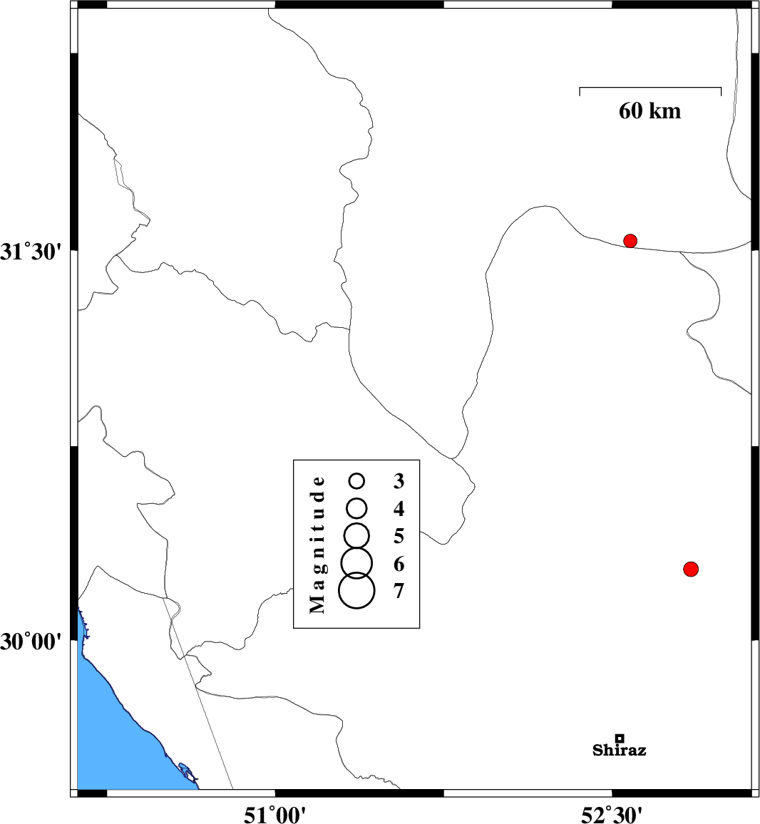 | 2015/04/09 | 21:39:57.6 | 02:09:57.6 | 29.65 | 51.89 | 21 | ML:2.9 | Fars Province, 23 km East of Kazerun | ||