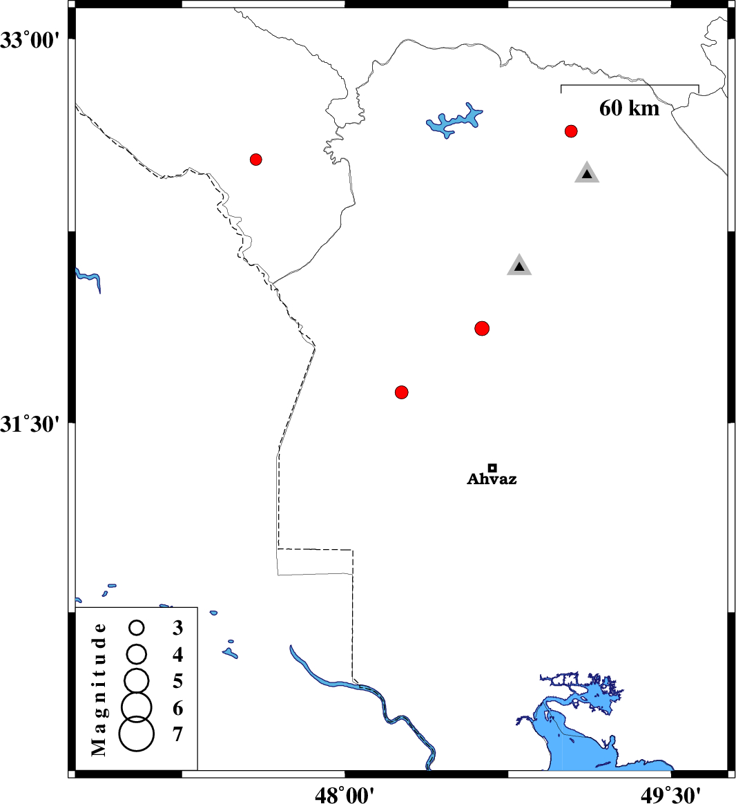| 2015/04/18 | 23:23:23.2 | 03:53:23.2 | 31.87 | 48.63 | 14 | ML:3 | Khoozestan Province, 29 km South-West of Shushtar | ||
