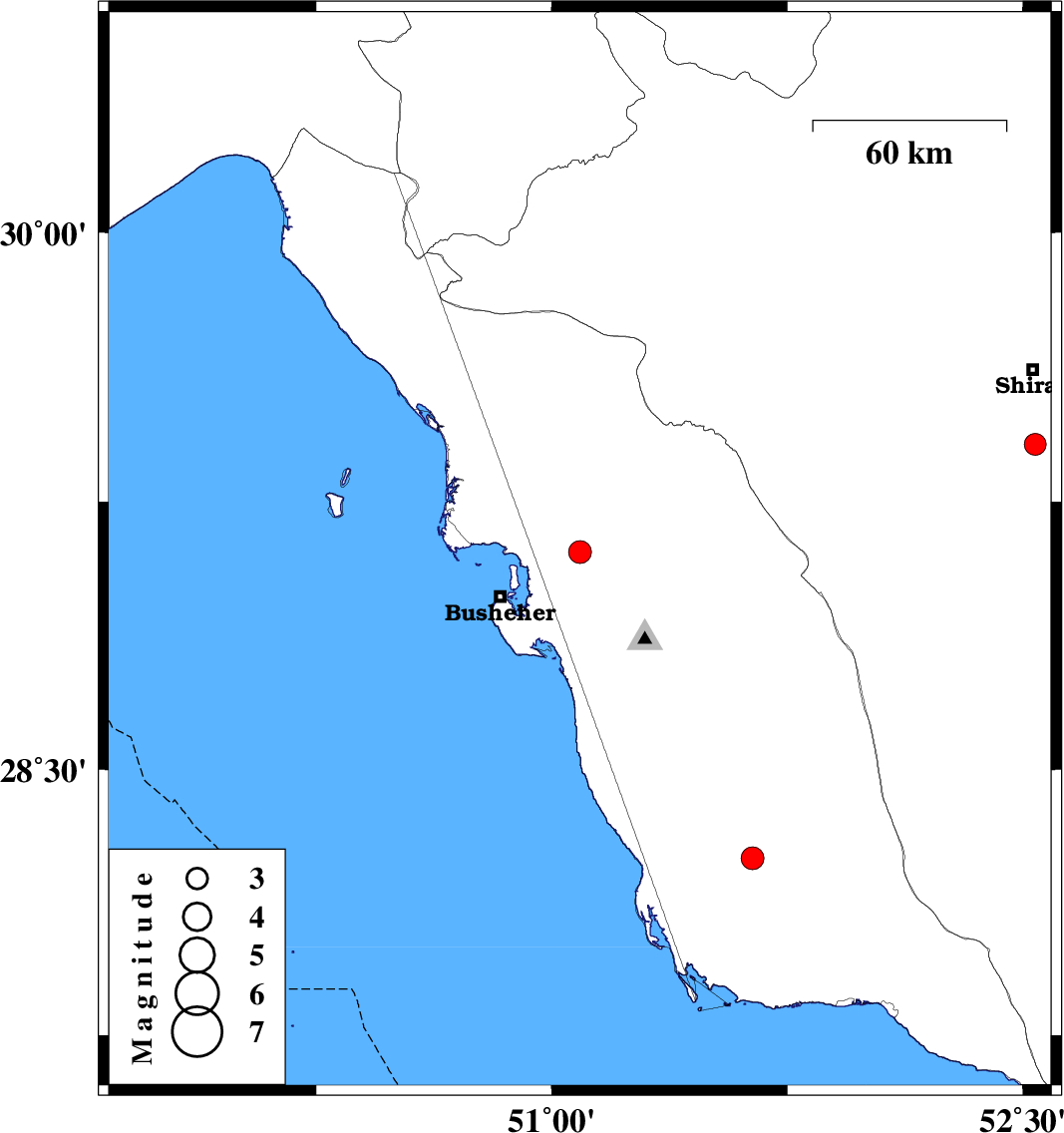 | 2015/04/18 | 23:04:55.3 | 03:34:55.3 | 29.11 | 51.09 | 14 | ML:3.3 | Bushehr Province, 20 km South-West of Borazjan | ||
