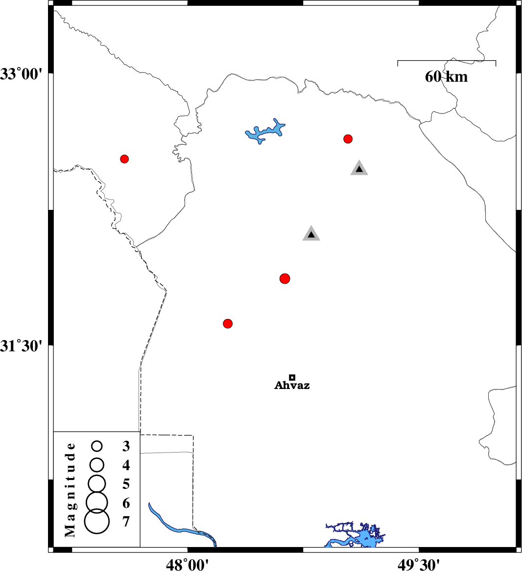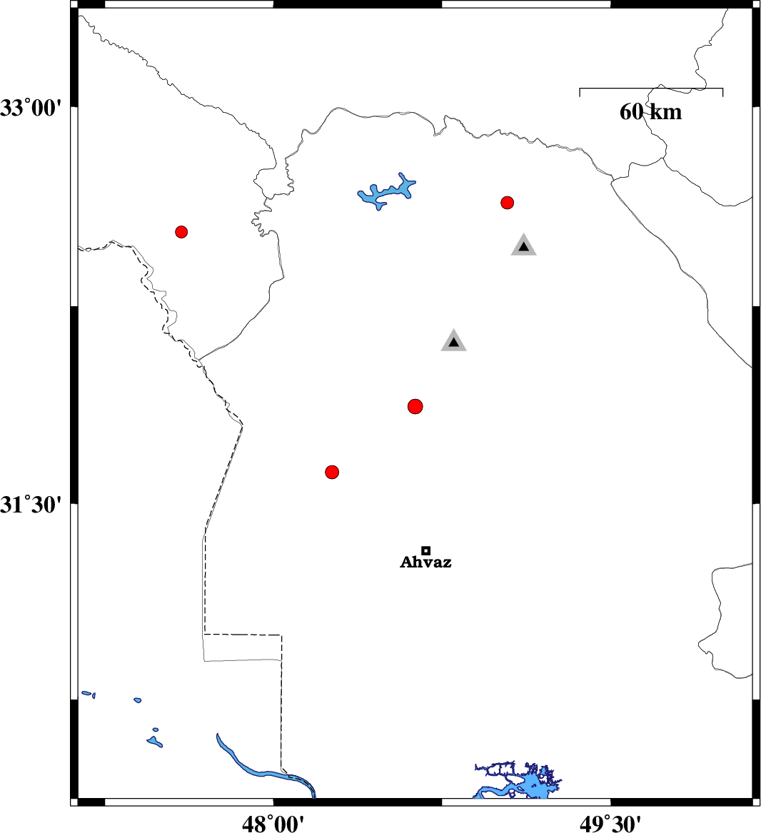 | 2015/04/18 | 23:23:23.2 | 03:53:23.2 | 31.87 | 48.63 | 14 | ML:3 | Khoozestan Province, 29 km South-West of Shushtar | ||