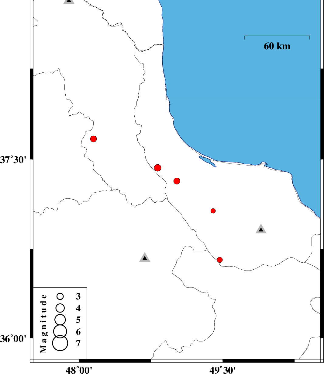 | 2015/04/19 | 02:30:02.7 | 07:00:02.7 | 37.32 | 49.02 | 14 | ML:3 | Gilan Province, 17 km South-West of Masal | ||