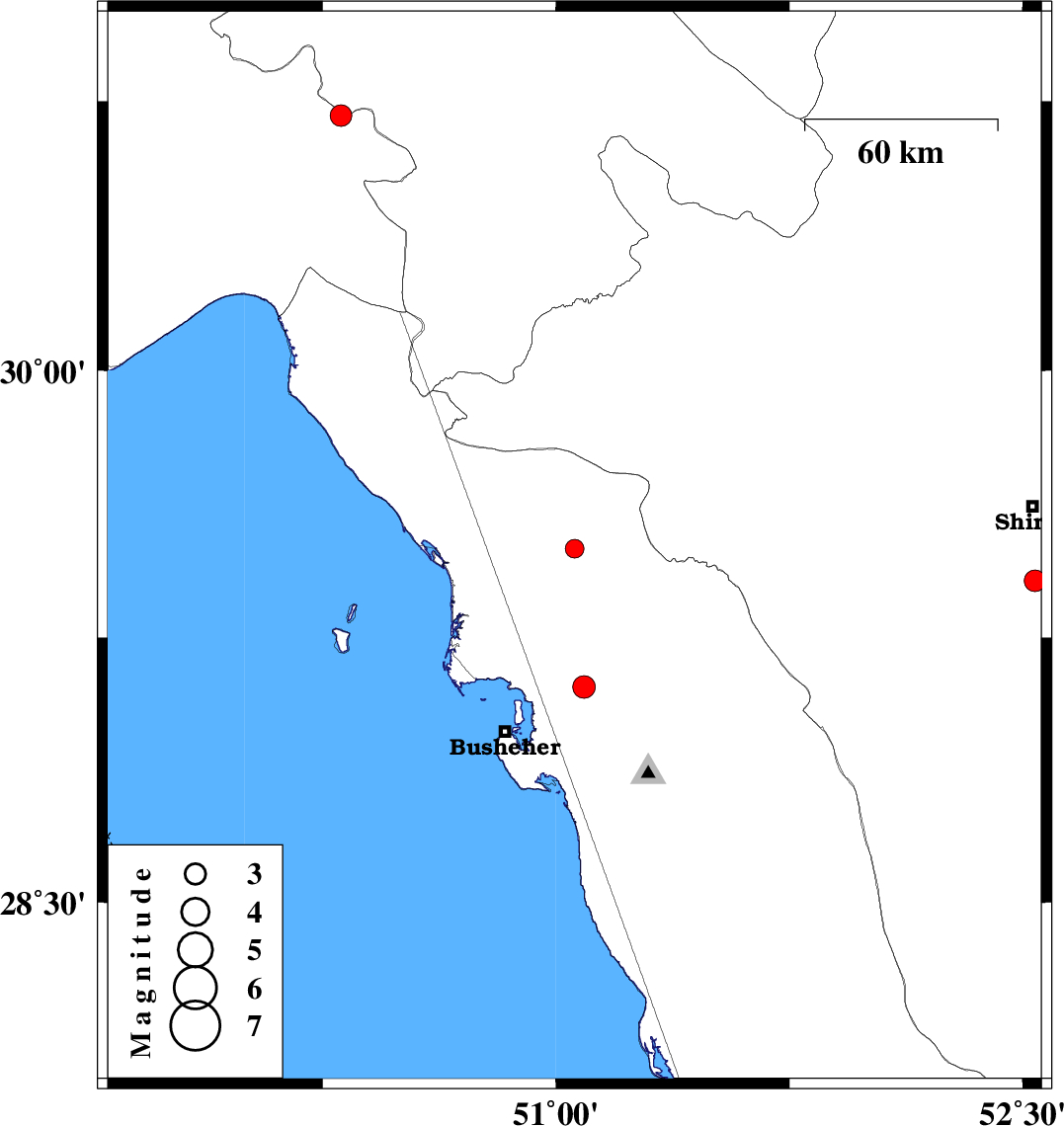 | 2015/04/20 | 02:26:39.1 | 06:56:39.1 | 29.5 | 51.06 | 6 | ML:2.7 | Bushehr Province, 30 km North-West of Borazjan | ||