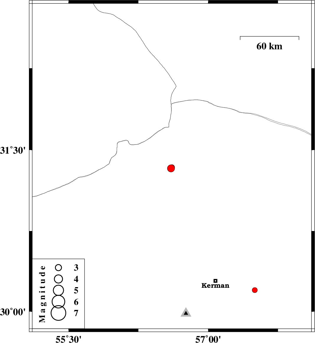 | 2015/04/22 | 00:34:17.2 | 05:04:17.2 | 30.2 | 57.5 | 15 | ML:2.6 | Kerman Province, 42 km East of Kerman |