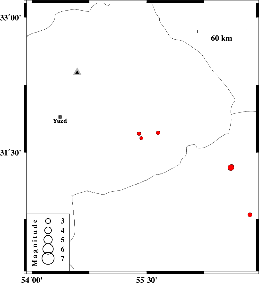 | 2015/05/03 | 08:06:04.5 | 12:36:04.5 | 31.72 | 55.65 | 14 | ML:2.2 | Yazd Province, 27 km North-East of Bafq | ||
