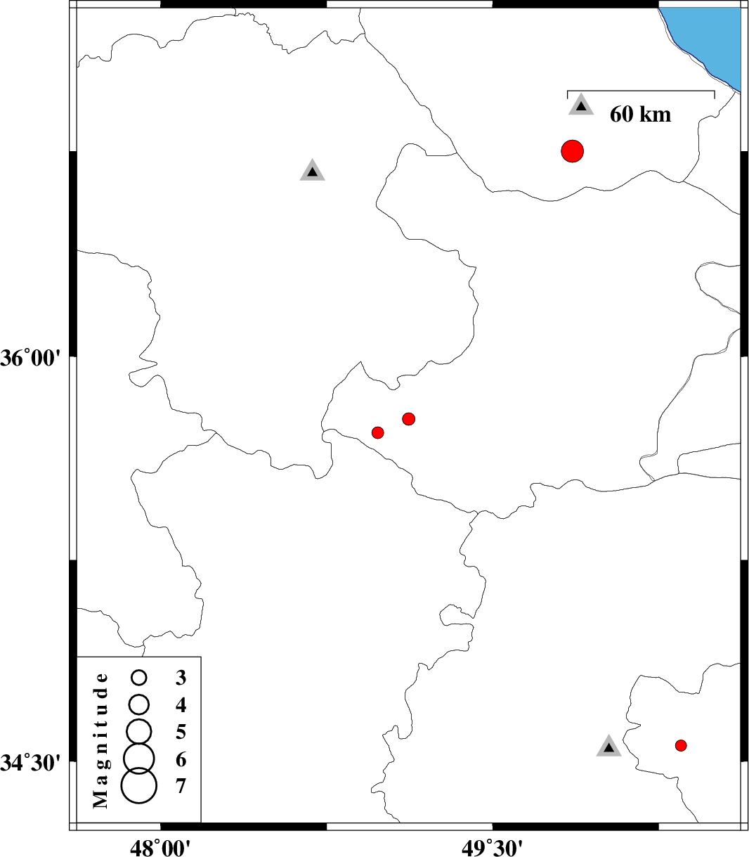 | 2015/05/10 | 09:18:11.2 | 13:48:11.2 | 35.72 | 48.98 | 14 | ML:2.4 | Ghazvin Province, 38 km North of Razan | ||