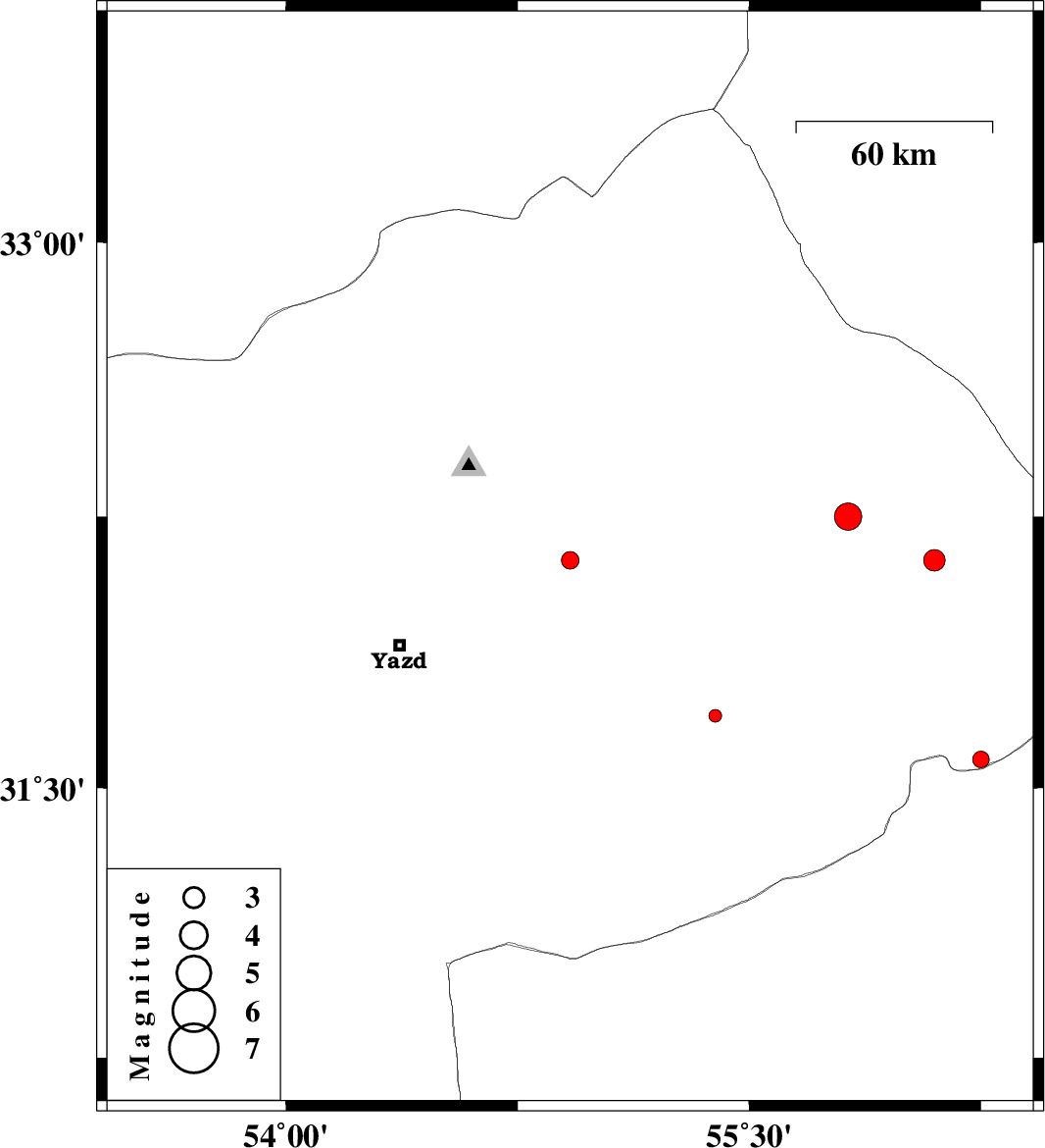 | 2015/05/11 | 05:04:49.3 | 09:34:49.3 | 32.13 | 54.92 | 14 | ML:2.5 | Yazd Province, 58 km North-East of Yazd | ||