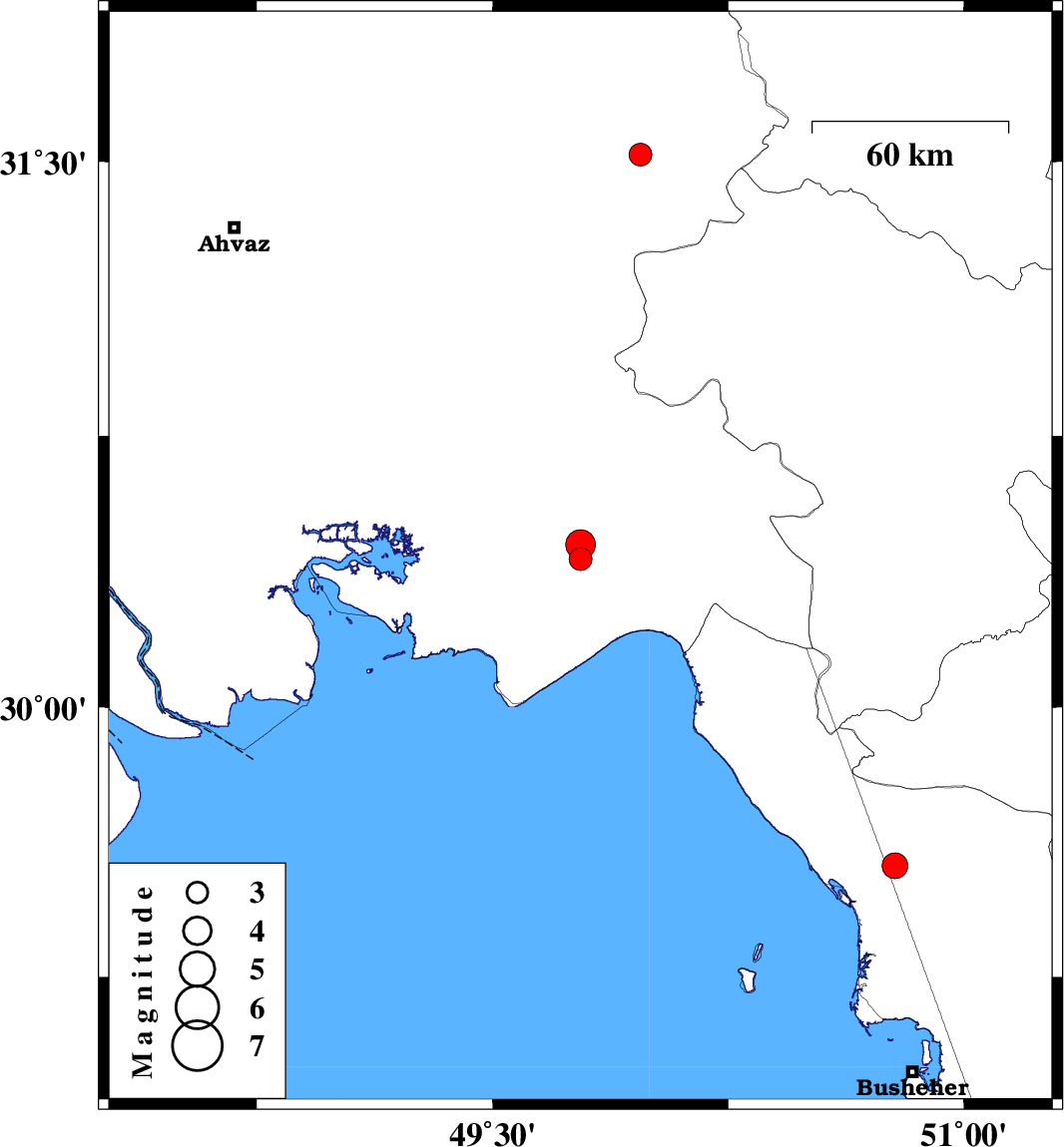 | 2015/05/11 | 09:06:17.1 | 13:36:17.1 | 30.41 | 49.78 | 14 | ML:3.2 | Khoozestan Province, 20 km North of Hendijan | ||