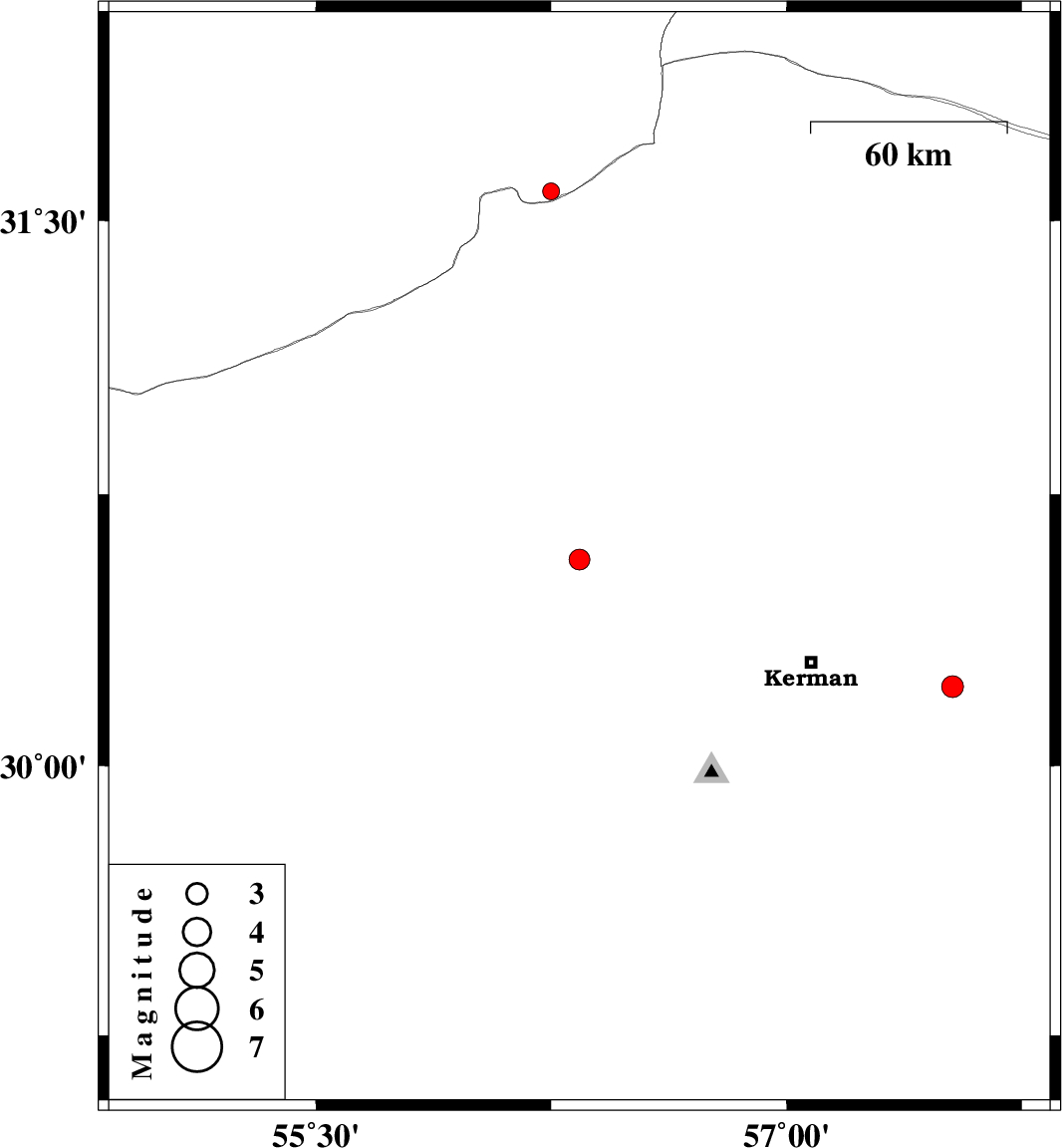 | 2015/05/11 | 09:05:18.2 | 13:35:18.2 | 30.22 | 57.53 | 14 | ML:3.1 | Kerman Province, 44 km East of Kerman | ||